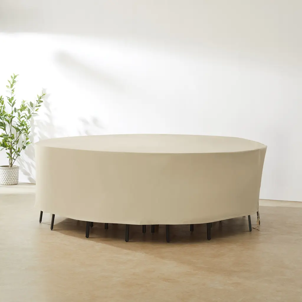 Give shelter to your outdoor furniture set with this round patio furniture cover. The cover is sewn from polyester reinforced with heavy-duty vinyl, and ready to face the elements, including snow, dirt, sap, rain, and more. Secure the cover with the sewn-in drawstring to maintain your patio sectional set’s beauty no matter the season. Designed to be universal, this cover fits a variety of round patio conversation sets and dining sets.