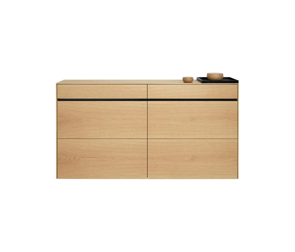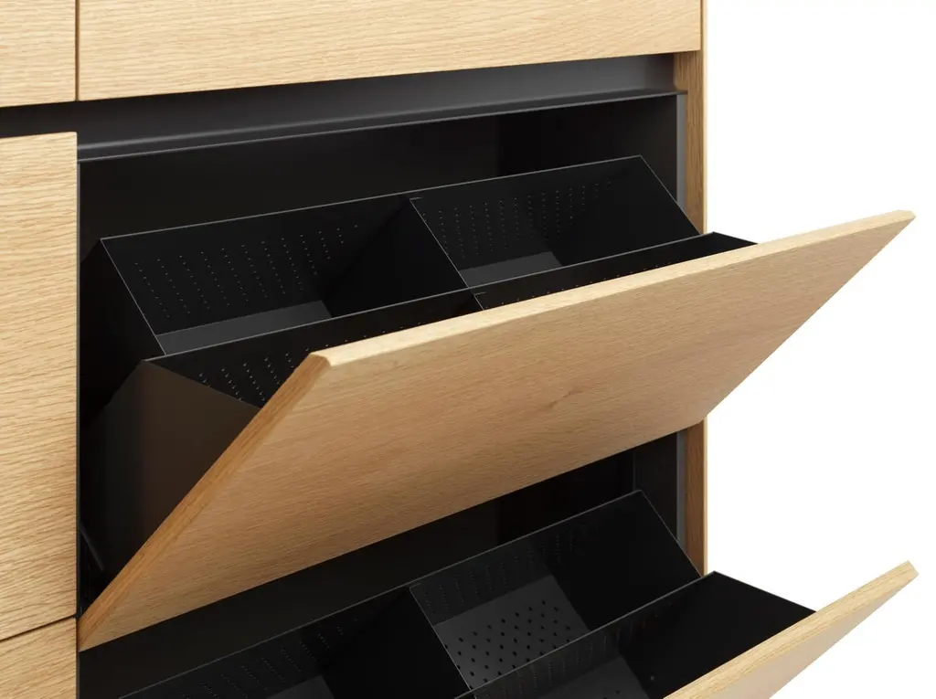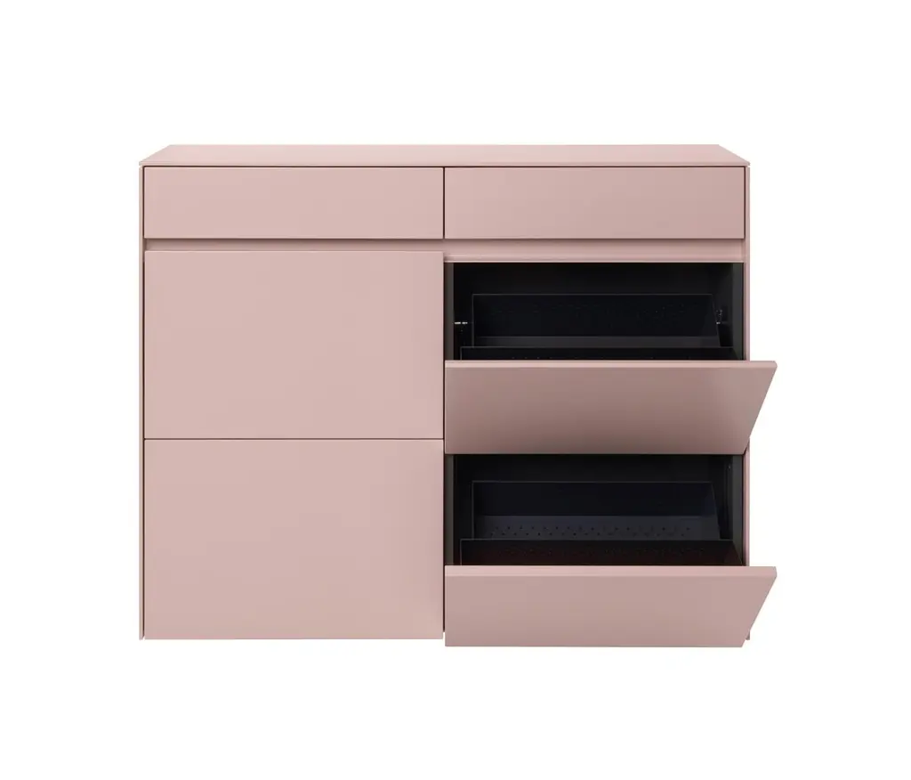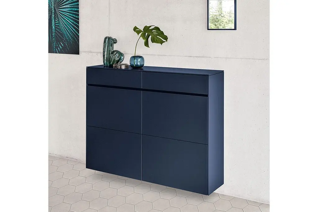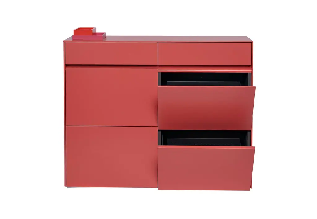 Shoe cabinet (60/60, handleless)on the left with 2 flaps opening simultaneously,double-row bin, 1 drawer, 4 - 6 pairs of shoes perflap and on the right with 1 door and 1 drawer, 2loose shelves, suspended or on plinth, must befixed to wall, lacquered topThe COVER shoe cabinet embodies sheer practicality. It comes in various widths and versions. The gripless front has either two linked flaps and a drawer, or a hinged door with height-adjustable shelves and a drawer. Other variants offer a combination of flaps and hinged doors. Elements can be combined up to a total width of 182 cm and topped with a continuous cover panel of back-painted glass or with a lacquered finish. Thanks to its purity of form, COVER can be a colour highlight or elegantly understated. There’s a variety of matt or high-gloss lacquers or finishes in oak or walnut to choose from. The cabinets can be wall-mounted or stand on a plinth. Compatible with any style of interior, COVER is a practical classic.