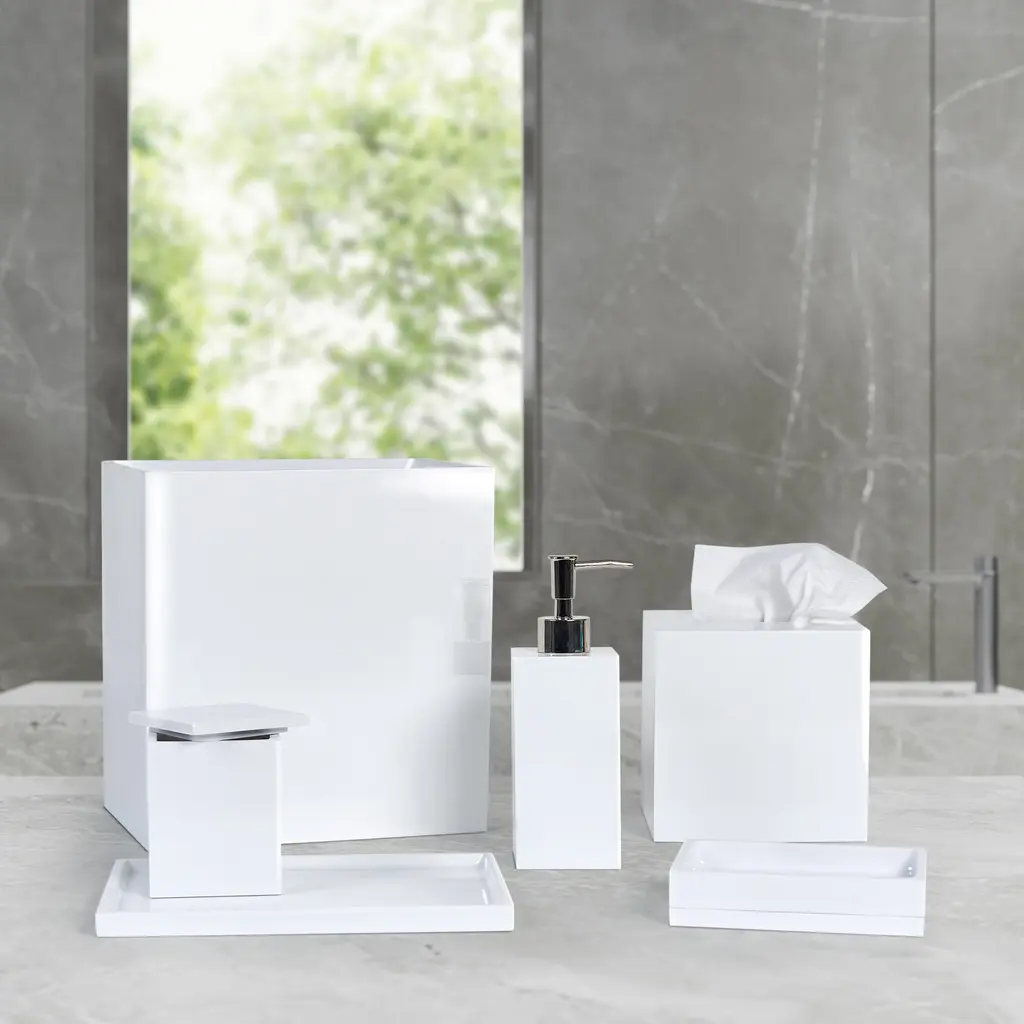 Cutting Edge Bath Accessories offer a clean modern-minimalist approach to organizing your countertops. The optic white accessories are made with heavyweight durable resin, with a clear glaze finish for a subtle shimmer and an easy-to-wipe clean surface. Pair these contemporary bathroom accessories with J. Queen New York shower curtains, towels and bath rugs for a complete look of luxury. Each bathroom accessory is sold separately.