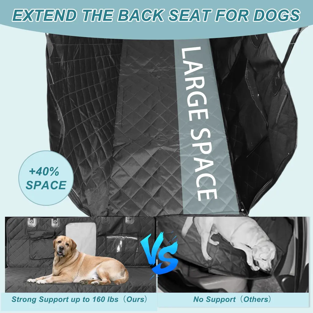 Features:The dog car seat cover for the back seat waterproof exterior coating, a non-slip bottom, PP cotton filling for softness and comfort, ion material for durability, and anti-scratch properties.The dog seat cover for the back seat is Enhanced with a raised design on all sides to protect pets and seats. The backseat cover for dogs in the car front features a mesh breathable structure for easy communication with pets, equipped with a mesh pocket for tablets, and additional storage pockets for miscellaneous items.Back seat pet cover for dogs Includes fixed seat anchors, multiple adjustable straps for secure and stable installation, two top fixed straps on both sides of the car door.NOTE:Because our pet booster seats are new from the factory, some new fabric smell is normal. Please open it and put it in the wind few days then use it.Specification:Color: BlackFront Height: 46cm / 18.11"Size: 137x47x55cm / 53.94"x18.5"x21.65“(L*W*H)Material: Cationic FabricPackage List:1 Pc Dog Car Seat Cover for Back Seat
