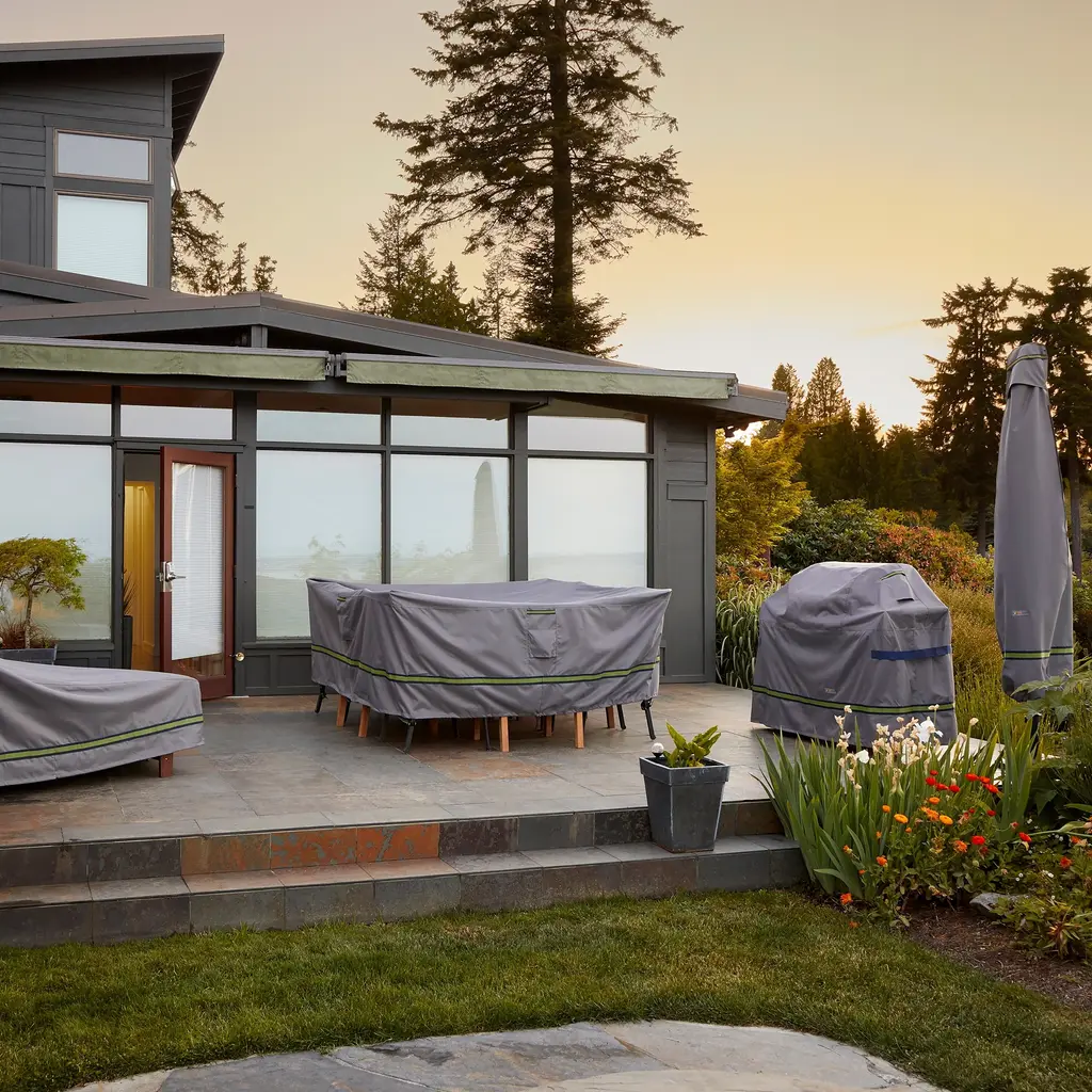 Ideal for use in harsh weather and high wind conditions. Duck Covers Soteria Series patio furniture covers are designed to protect patio furniture from dust, dirt, sun, rain and heavy snow. Manufactured using a durable fabric with a waterproof backing features a sporty webbed accent. Tape sealing at critical seams prevents leaking and double-stitched seams provide extra durability. Grey color. Two-year limited warranty has you covered. Migrate to Duck Covers today!