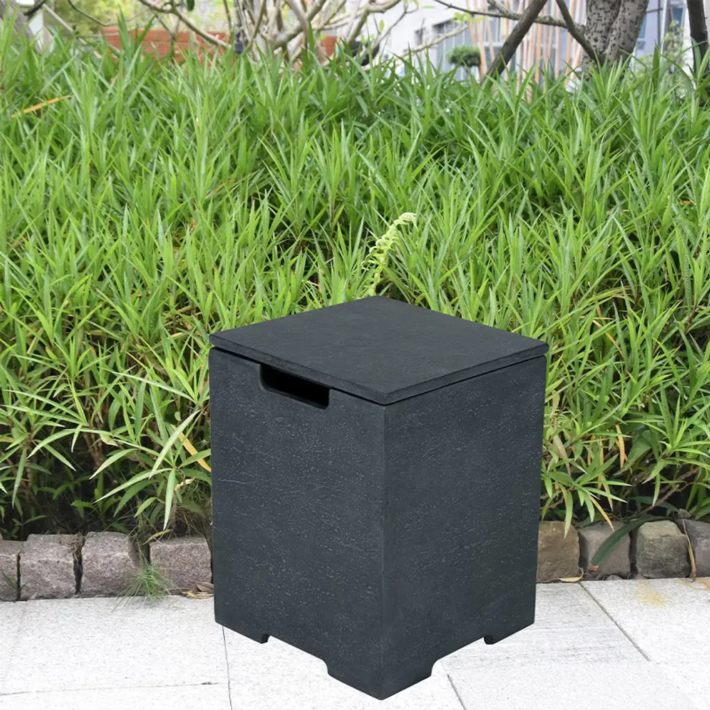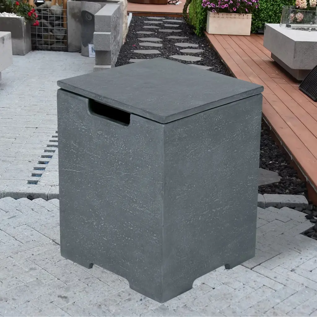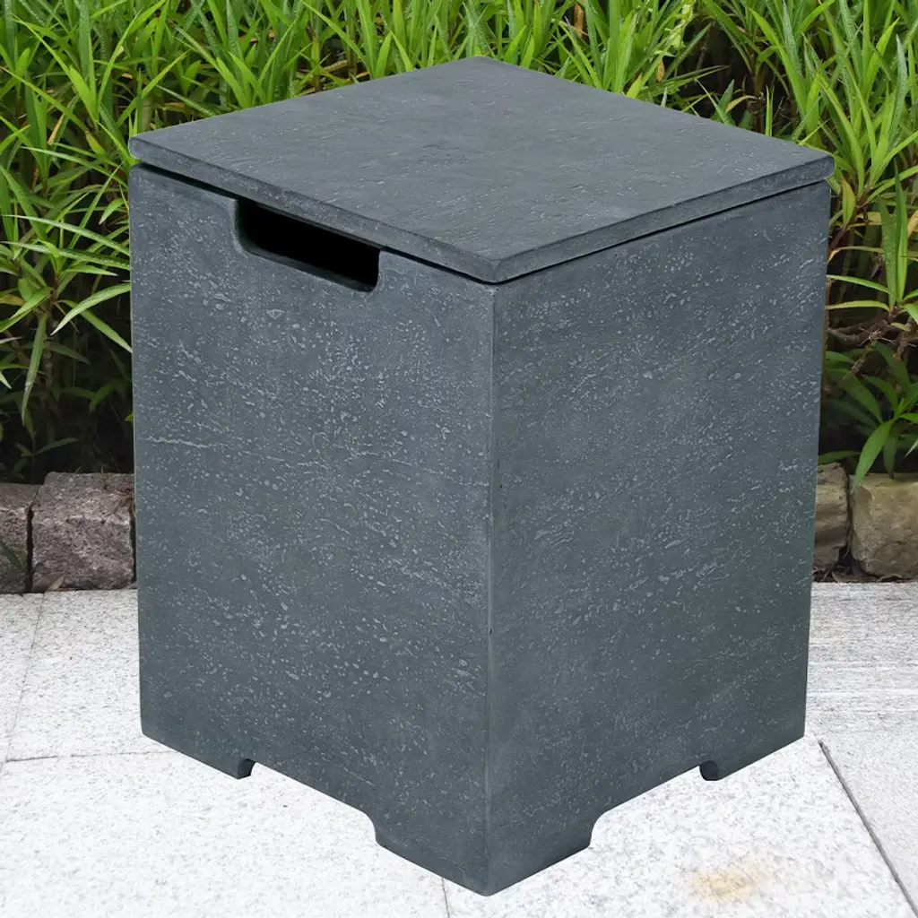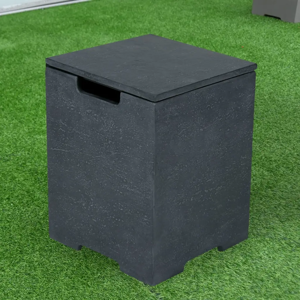 The versatile propane tank cover table is a stylish and functional solution to conceal unsightly propane tanks. It not only hides your propane tank from view, but also doubles as a modern side table or end table for your outdoor furniture. Whether you're using it as a storage box for your propane tank or as a decorative accent piece, it's the perfect addition to any outdoor fireplace. Crafted from glass-fiber reinforced concrete, this tank cover is built to last. It easily fits over a propane tank, providing protection against rain, snow, wind, and sun damage. It can accommodate standard 20-pound and 15-pound propane tanks with ease. Not only does this propane tank cover table add functionality to your outdoor fireplace, but it also enhances its aesthetic appeal. Whether you're hosting a backyard barbecue or simply enjoying a quiet evening around the fire pit, this cover seamlessly blends in with your outdoor furniture, creating a cohesive and polished look. Easily move it around your patio or deck as needed, use it as a coffee table near the firepit while hiding your liquid propane tank. The propane tank cover table is the perfect solution for anyone looking to keep their propane tank out of sight and out of mind. With its durable construction, versatile design, and stylish appearance, it's a must-have accessory for any outdoor fireplace.