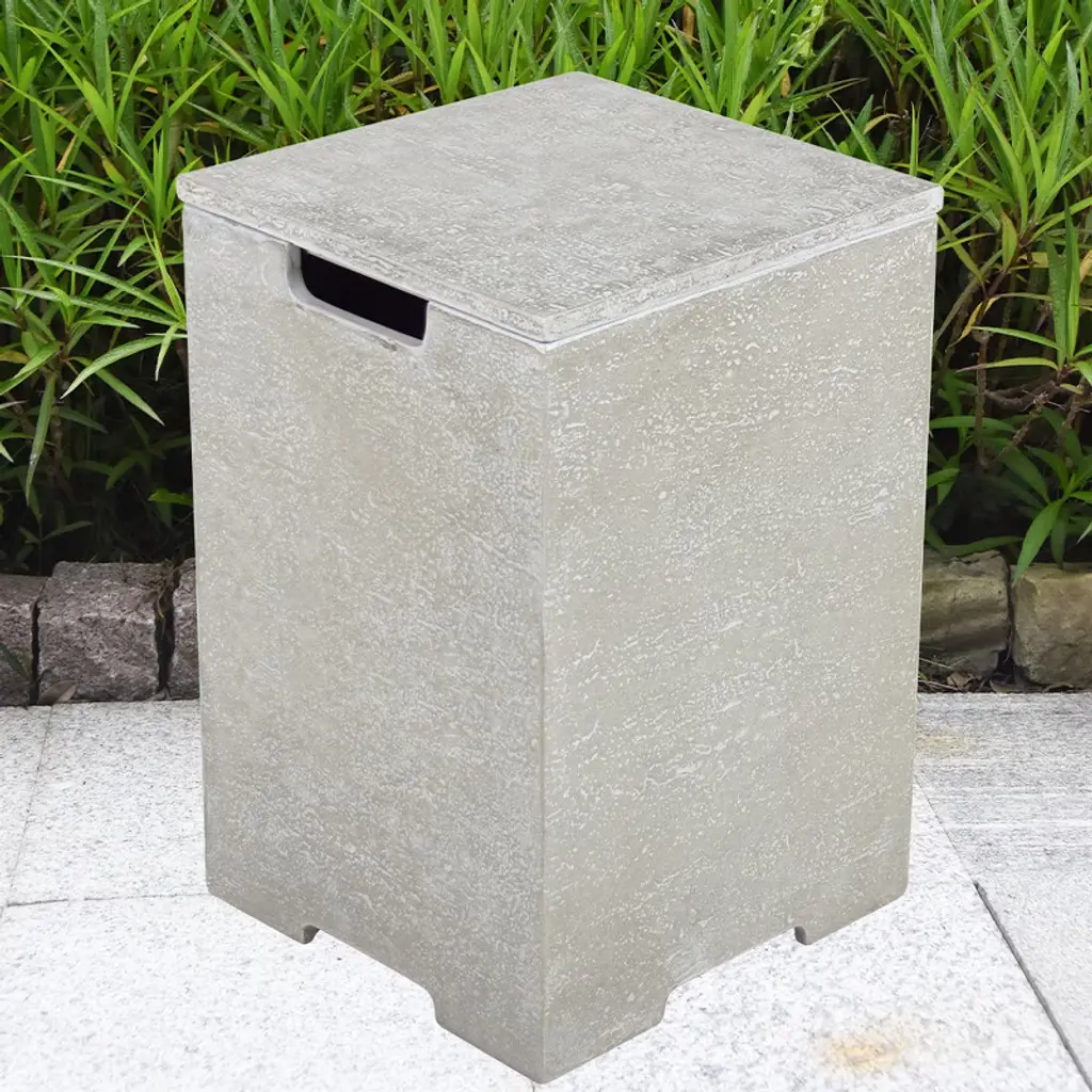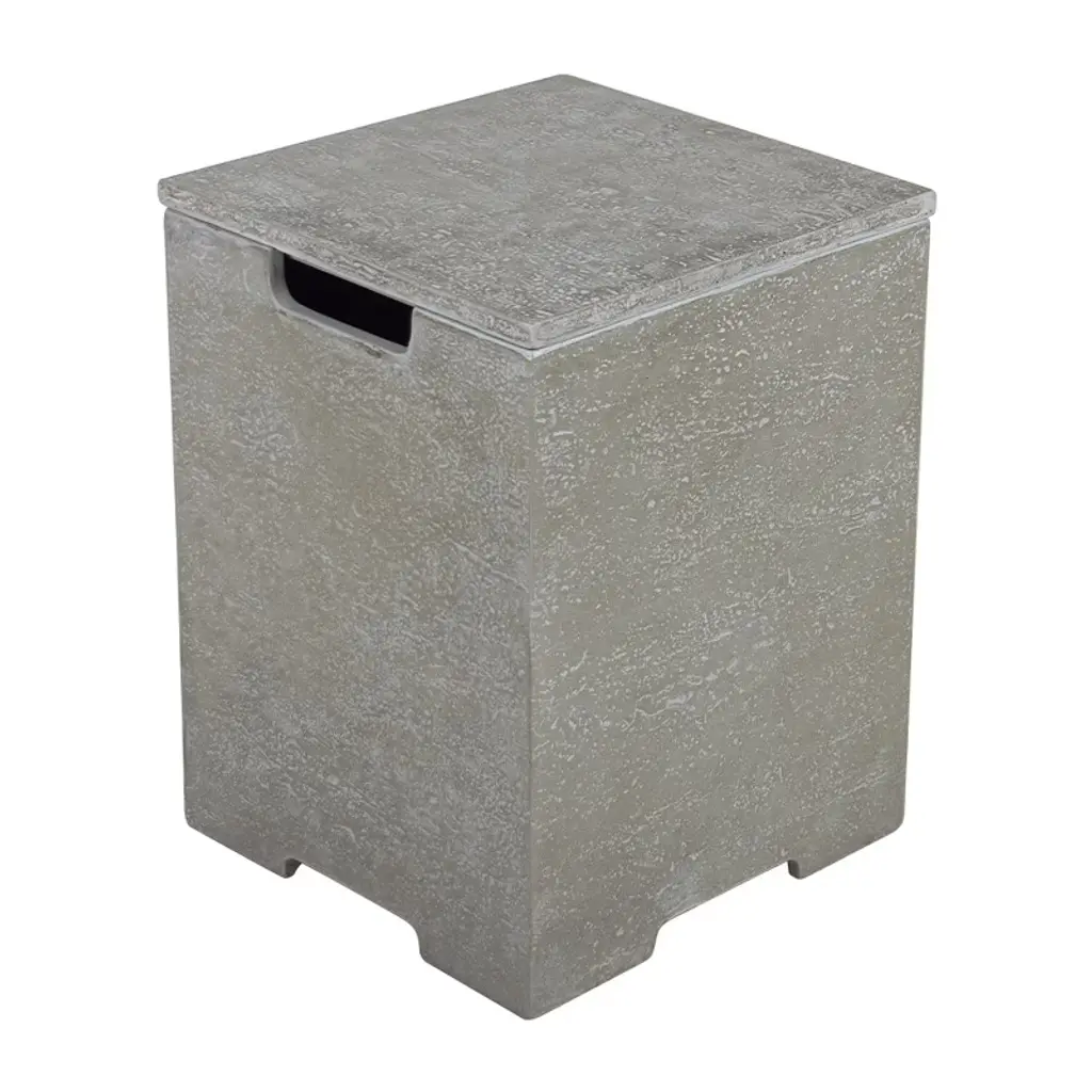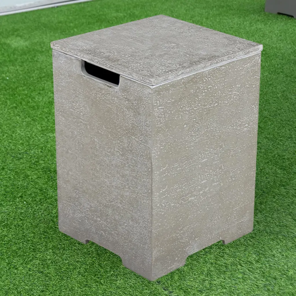 The versatile propane tank cover table is a stylish and functional solution to conceal unsightly propane tanks. It not only hides your propane tank from view, but also doubles as a modern side table or end table for your outdoor furniture. Whether you're using it as a storage box for your propane tank or as a decorative accent piece, it's the perfect addition to any outdoor fireplace. Crafted from glass-fiber reinforced concrete, this tank cover is built to last. It easily fits over a propane tank, providing protection against rain, snow, wind, and sun damage. It can accommodate standard 20-pound and 15-pound propane tanks with ease. Not only does this propane tank cover table add functionality to your outdoor fireplace, but it also enhances its aesthetic appeal. Whether you're hosting a backyard barbecue or simply enjoying a quiet evening around the fire pit, this cover seamlessly blends in with your outdoor furniture, creating a cohesive and polished look. Easily move it around your patio or deck as needed, use it as a coffee table near the firepit while hiding your liquid propane tank. The propane tank cover table is the perfect solution for anyone looking to keep their propane tank out of sight and out of mind. With its durable construction, versatile design, and stylish appearance, it's a must-have accessory for any outdoor fireplace.