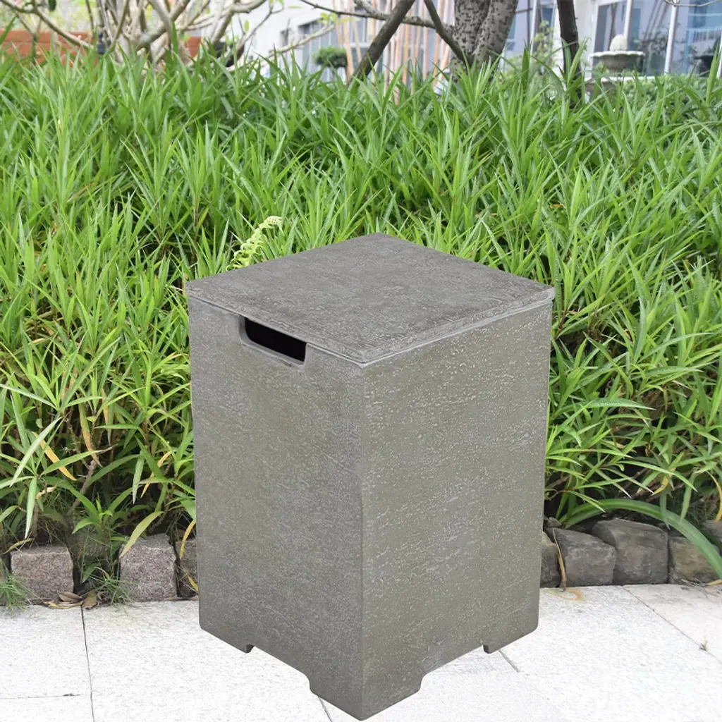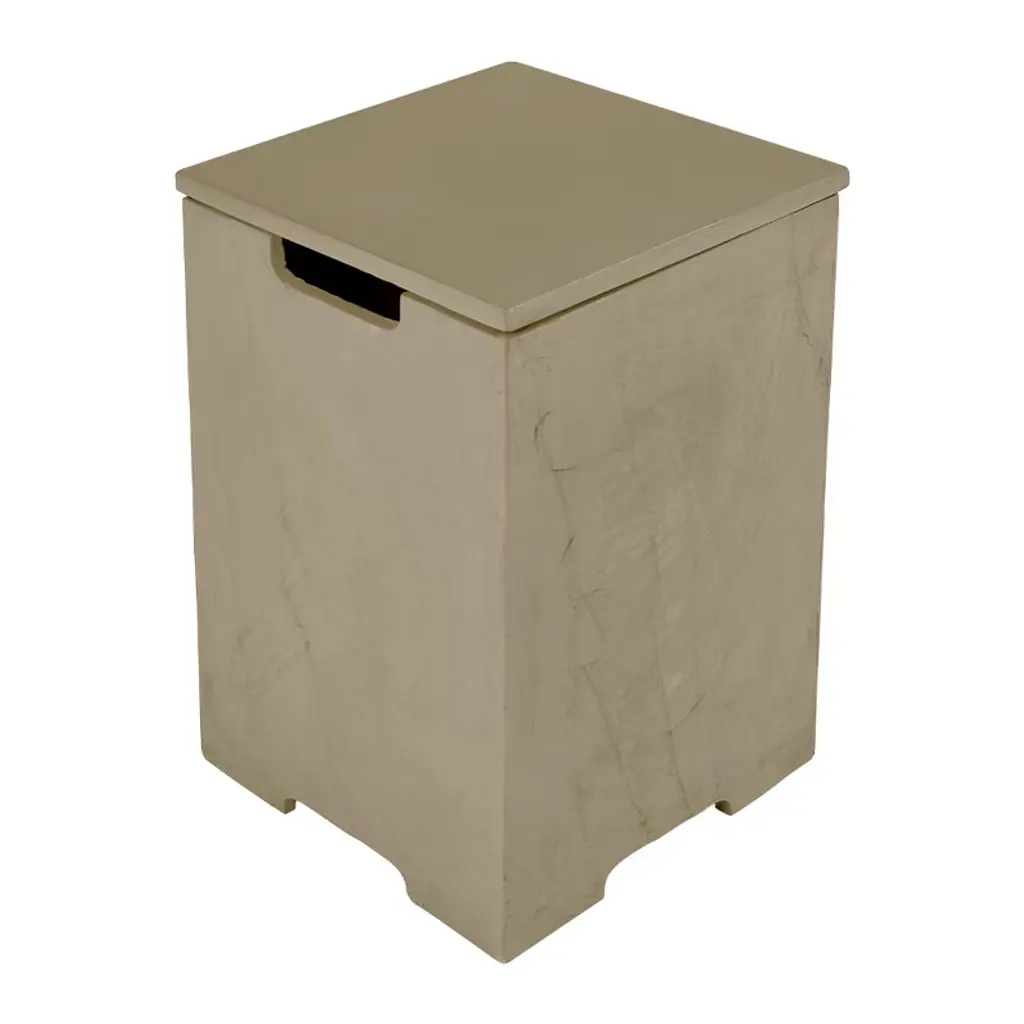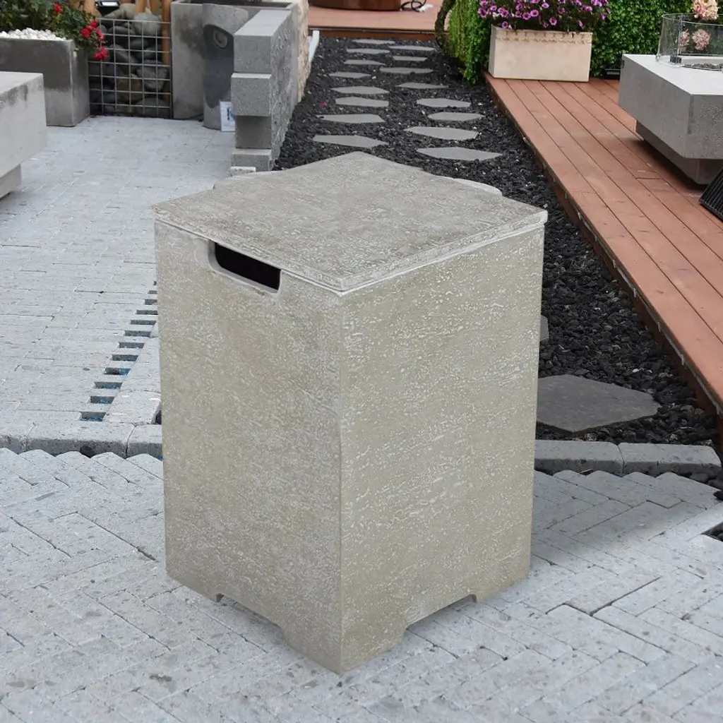 The versatile propane tank cover table is a stylish and functional solution to conceal unsightly propane tanks. It not only hides your propane tank from view, but also doubles as a modern side table or end table for your outdoor furniture. Whether you're using it as a storage box for your propane tank or as a decorative accent piece, it's the perfect addition to any outdoor fireplace. Crafted from glass-fiber reinforced concrete, this tank cover is built to last. It easily fits over a propane tank, providing protection against rain, snow, wind, and sun damage. It can accommodate standard 20-pound and 15-pound propane tanks with ease. Not only does this propane tank cover table add functionality to your outdoor fireplace, but it also enhances its aesthetic appeal. Whether you're hosting a backyard barbecue or simply enjoying a quiet evening around the fire pit, this cover seamlessly blends in with your outdoor furniture, creating a cohesive and polished look. Easily move it around your patio or deck as needed, use it as a coffee table near the firepit while hiding your liquid propane tank. The propane tank cover table is the perfect solution for anyone looking to keep their propane tank out of sight and out of mind. With its durable construction, versatile design, and stylish appearance, it's a must-have accessory for any outdoor fireplace.