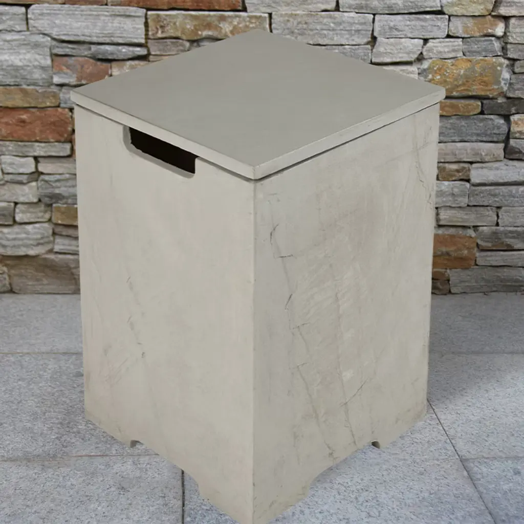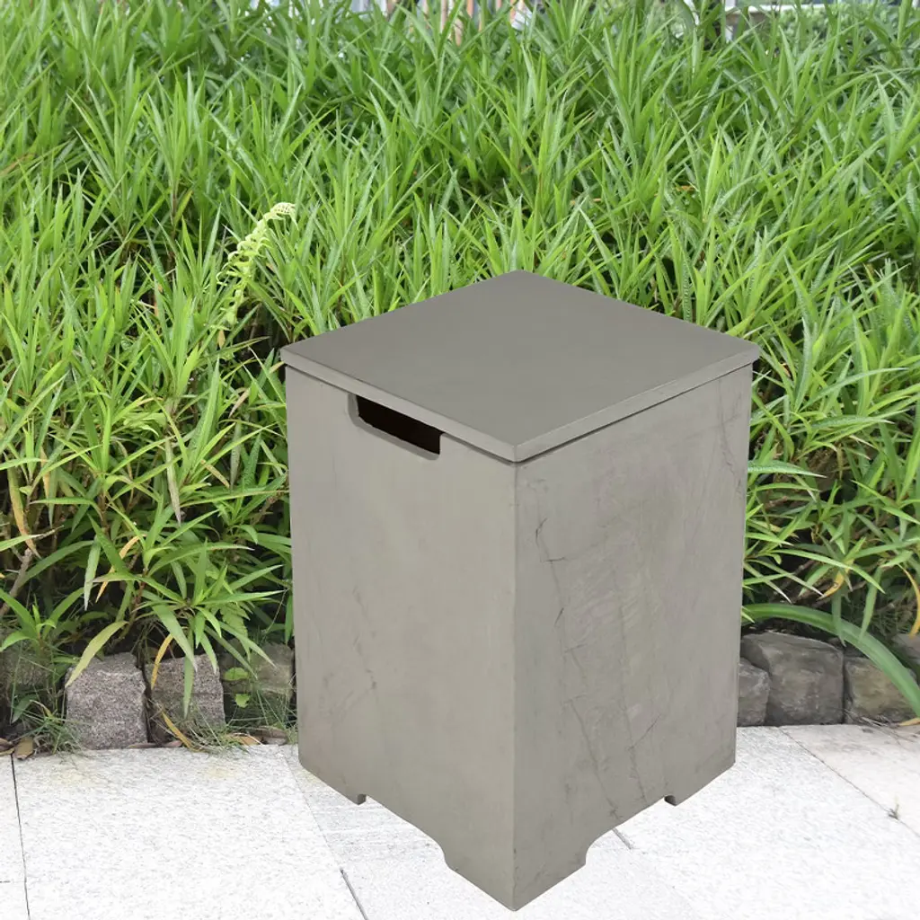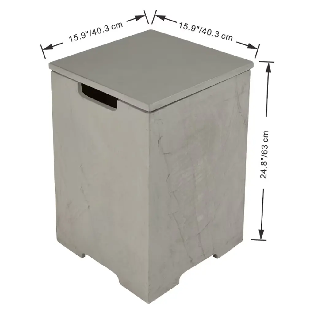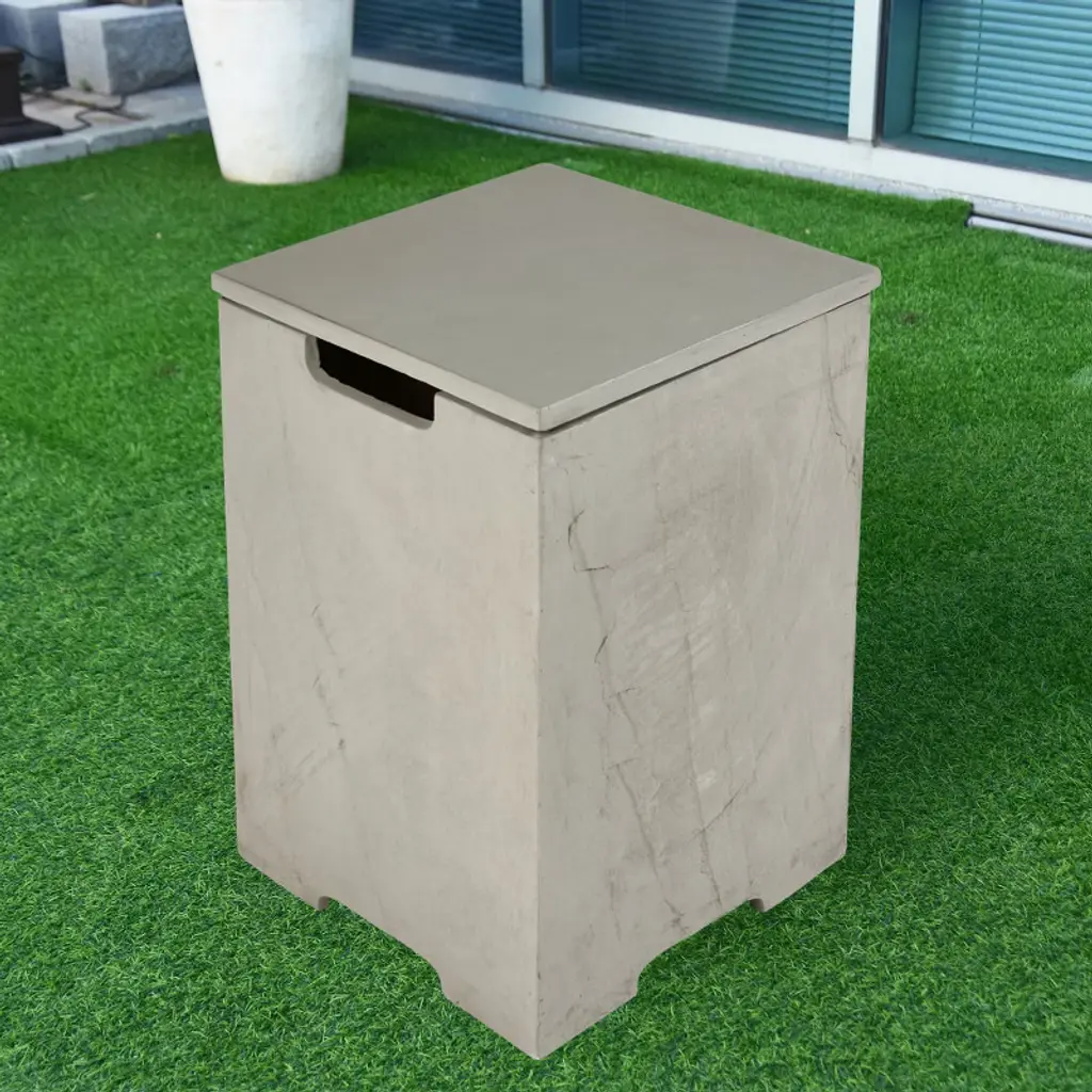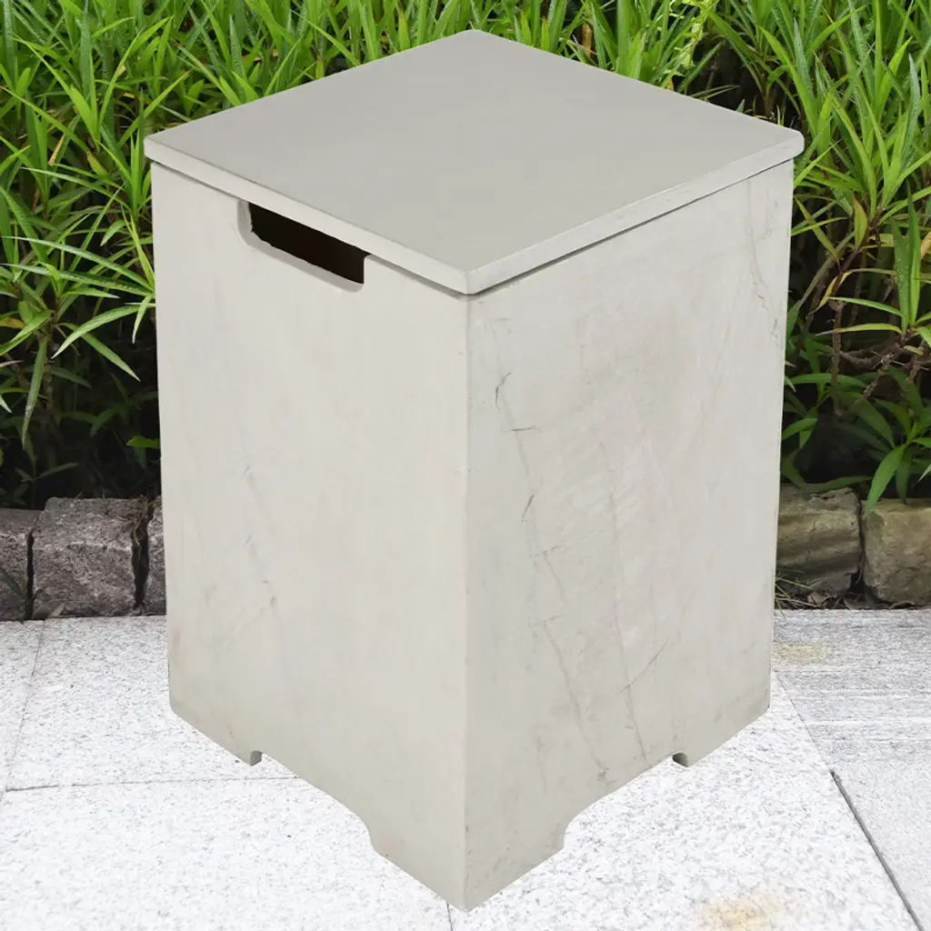 The versatile propane tank cover table is a stylish and functional solution to conceal unsightly propane tanks. It not only hides your propane tank from view, but also doubles as a modern side table or end table for your outdoor furniture. Whether you're using it as a storage box for your propane tank or as a decorative accent piece, it's the perfect addition to any outdoor fireplace. Crafted from glass-fiber reinforced concrete, this tank cover is built to last. It easily fits over a propane tank, providing protection against rain, snow, wind, and sun damage. It can accommodate standard 20-pound and 15-pound propane tanks with ease. Not only does this propane tank cover table add functionality to your outdoor fireplace, but it also enhances its aesthetic appeal. Whether you're hosting a backyard barbecue or simply enjoying a quiet evening around the fire pit, this cover seamlessly blends in with your outdoor furniture, creating a cohesive and polished look. Easily move it around your patio or deck as needed, use it as a coffee table near the firepit while hiding your liquid propane tank. The propane tank cover table is the perfect solution for anyone looking to keep their propane tank out of sight and out of mind. With its durable construction, versatile design, and stylish appearance, it's a must-have accessory for any outdoor fireplace.