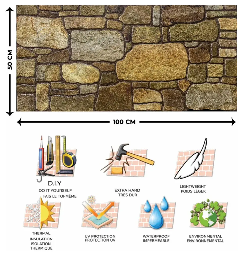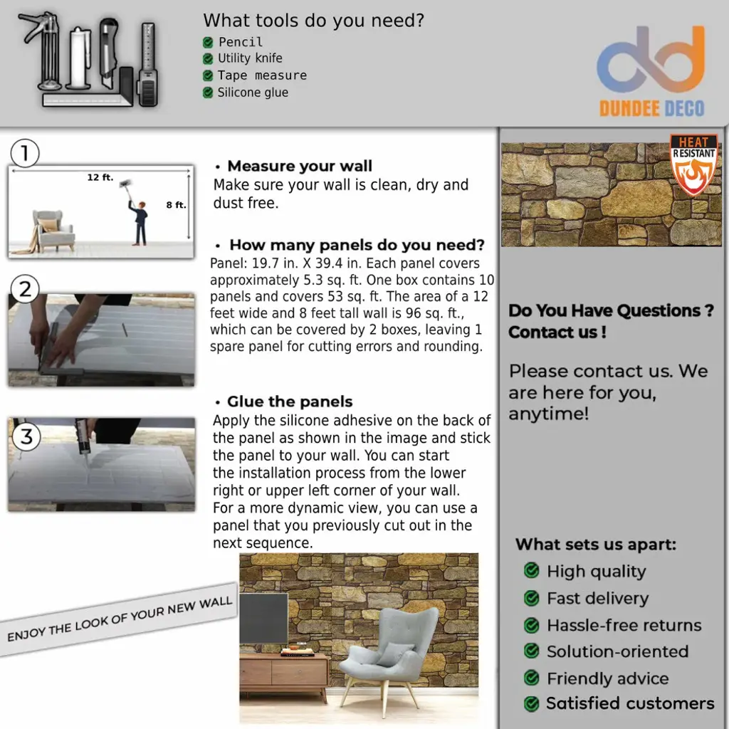 You can use our panels for residential and commercial decoration. The application landscape includes homes, cafes, restaurants, hotels, exhibition stands, offices, shops, and showcase decorations. The Dundee Deco Styrofoam Wall Panels can be installed without professional help. You can do it yourself. The structure and characteristics of our panels add value to any construction project by preventing moisture and providing thermal insulation. The Dundee Deco panels do not deform over time, are water-resistant and impact-resistant, non-flammable, and are 100% environmentally friendly. The products can be used for Interior and Exterior applications. For exterior applications, please use water-based varnish.Features:• REAL 3D Brick Stone Look - Made of high-quality EPS material, this wall panel provides a REALISTIC FEEL at a fraction of the cost.• PERFECT SIZE AND DESIGN - Dundee Deco panels are 39.4 in (100 cm) in length and 19.7 in (50 cm) in height with thicknesses of 0.79in (2 cm).• USE IT ANYWHERE - This 3D Wall Panel is designed for INDOOR and OUTDOOR use and can easily be applied to ANY SURFACE.• DIY FRIENDLY - You can apply your walls and ceilings with Dundee Deco Styrofoam 3D wall panels without professional help. You can simply apply it with construction glue, no other special tools are needed• EXCELLENT HEAT AND SOUND INSULATION - Dundee Deco 3D wall panel facing bricks also offer a variety of decorative combinations and fit into almost any ambiance.• Thanks to it''s surface structure, you do not feel the artificial effect of applying Dundee Deco wall tiles. Whether brick or stone look, the cladding of the wall panels is always elegant and durable.• The decorative 3D Wall Panels are available in a Set of 10 and cover 54 square feet per pack. One board weighs 3 lbs (1.35 Kg).• The panels can be used in moist environment because of insulation properties of their material. It provides thermal and moisture insulation and does not change shape over time.• The styrofoam wall panels are suitable for homes, businesses, cafes, hotels, offices, exhibition stands, restaurants, and decorating showcases.