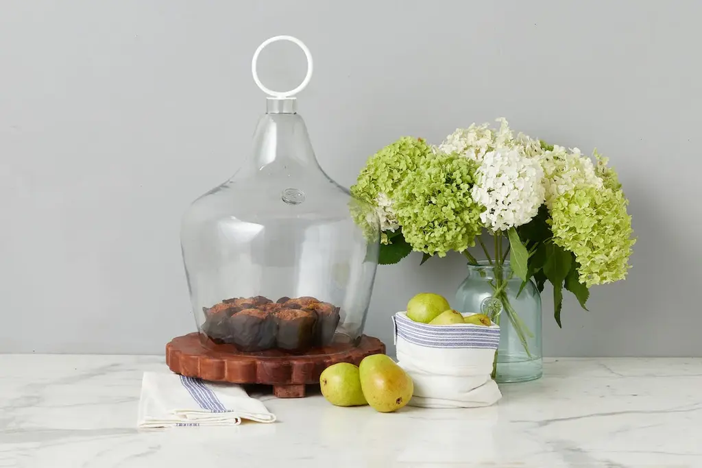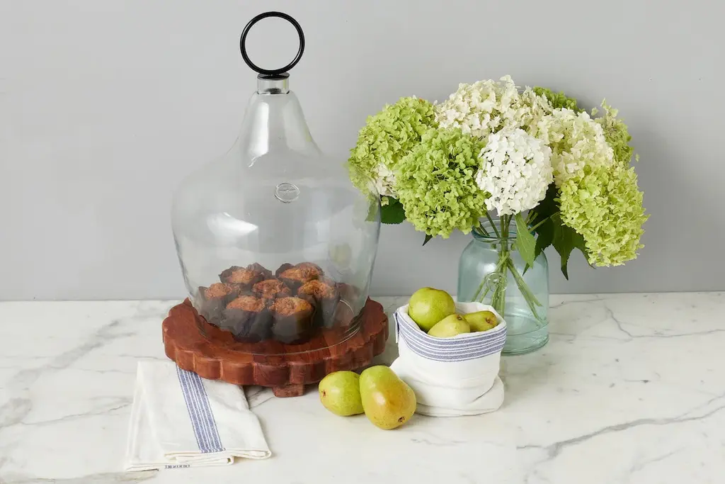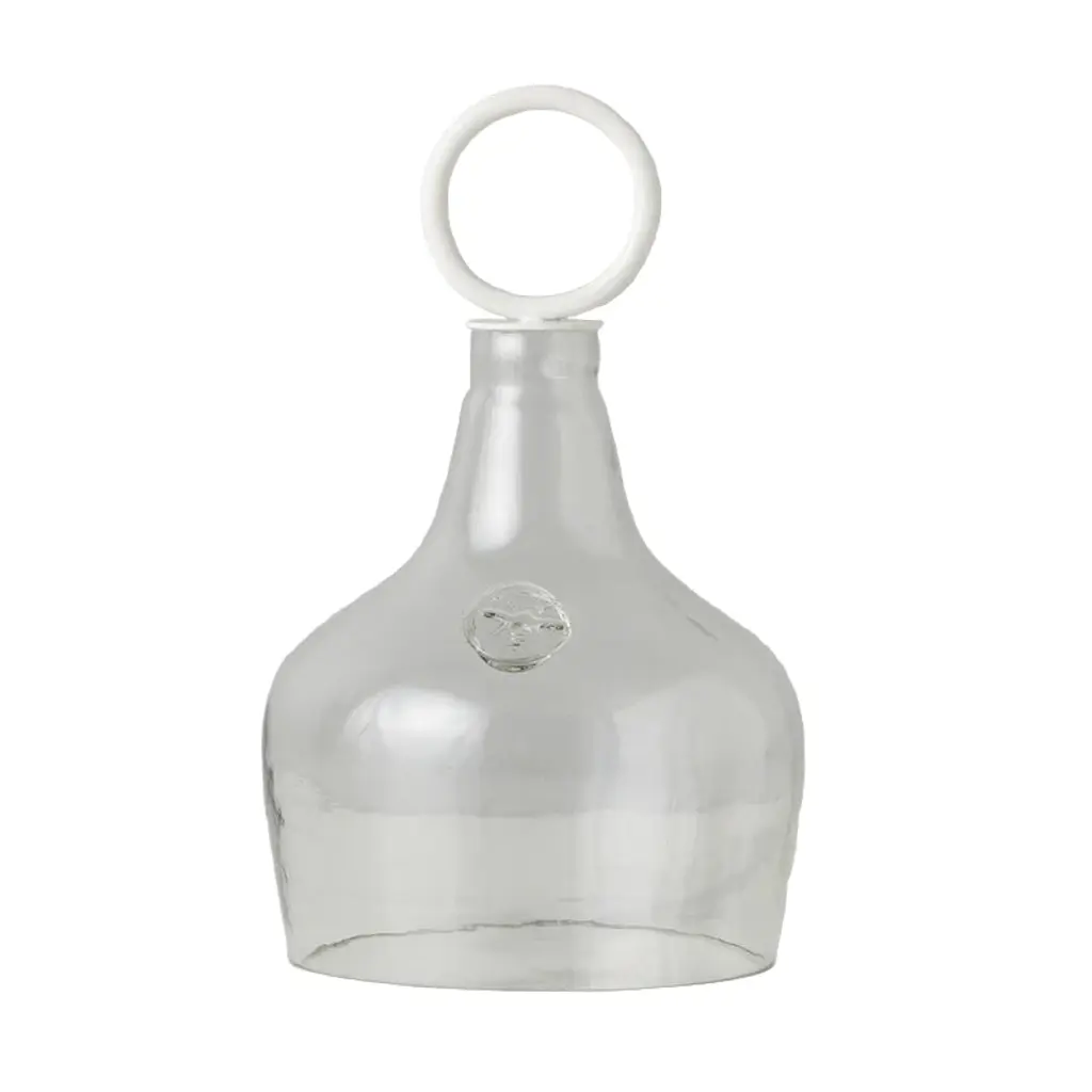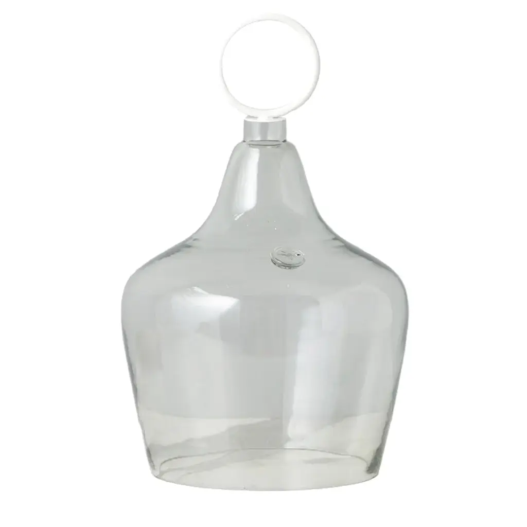 The dramatic silhouette of a classic wine bottle demijohn inspired our Glass Cloche. The glass cloche is topped with a black iron ring handle. This decorative accent is handmade and pairs with serveware like cake stands, trays and trivets for a large array of styles and arrangements. Care and Maintenance Hand wash or spot clean with a soft, damp cloth. Avoid liquid cleansers, glass cleaner, soap or abrasive agents containing alcohol. Do not soak or leave standing in water.