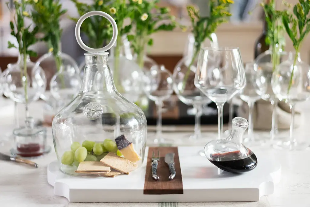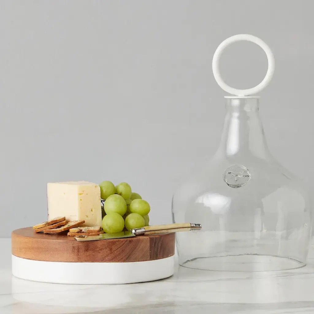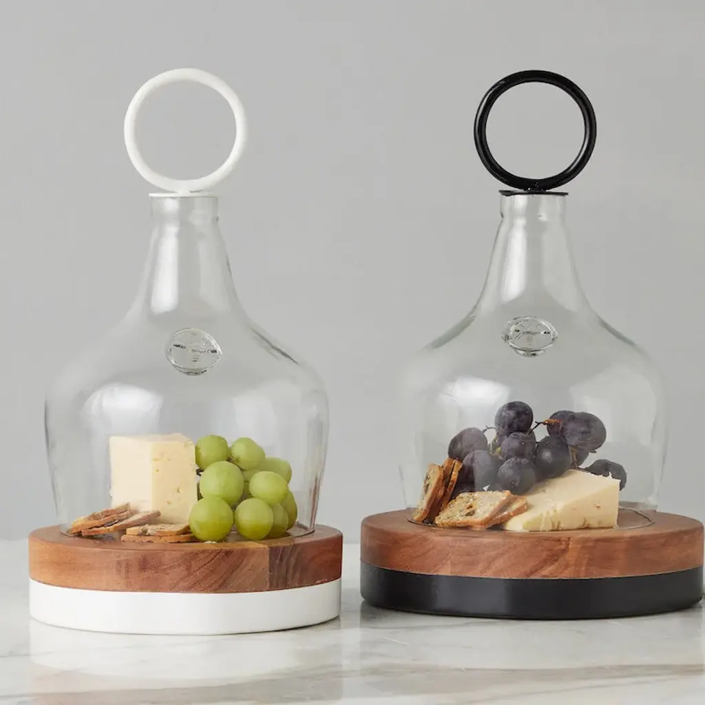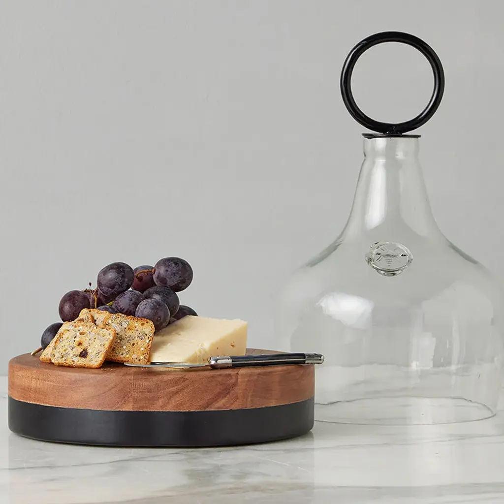 The dramatic silhouette of a classic wine bottle demijohn inspired our Glass Cloche. The glass cloche is topped with a black iron ring handle. This decorative accent is handmade and pairs with serveware like cake stands, trays and trivets for a large array of styles and arrangements. Care and Maintenance Hand wash or spot clean with a soft, damp cloth. Avoid liquid cleansers, glass cleaner, soap or abrasive agents containing alcohol. Do not soak or leave standing in water.