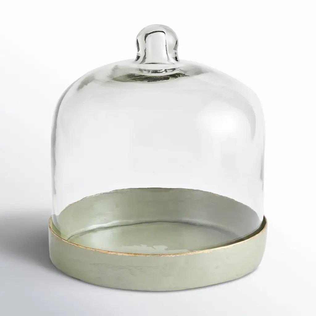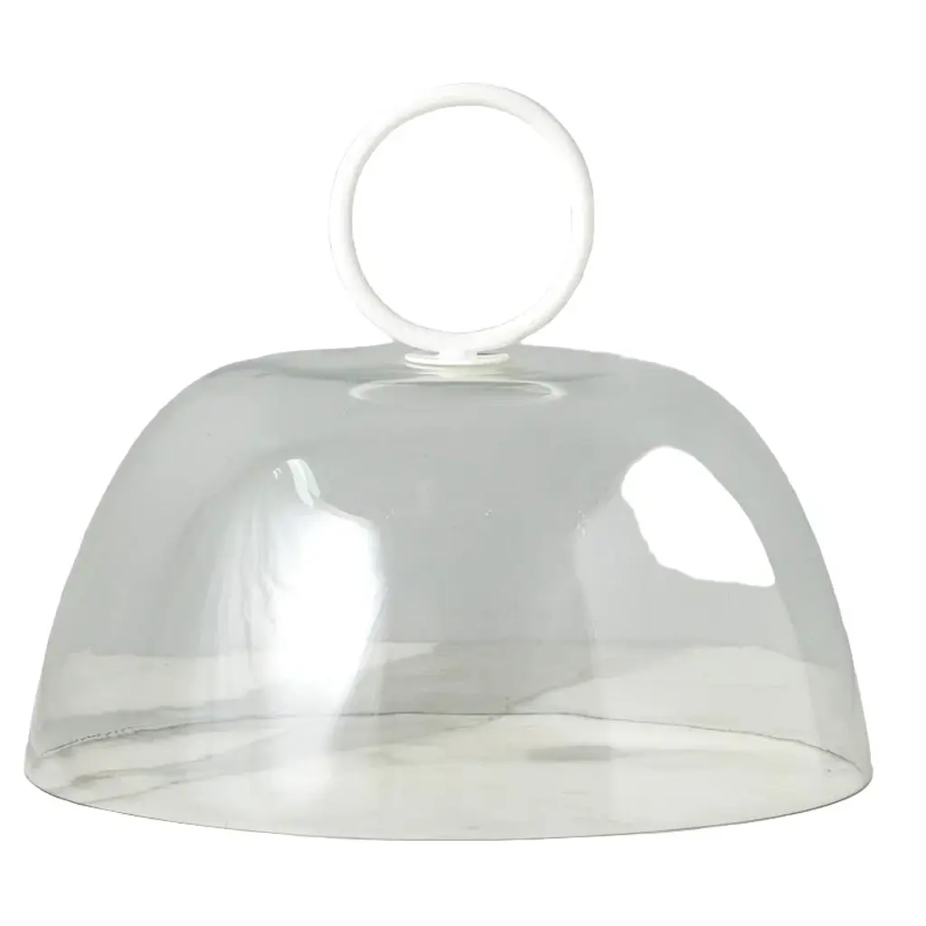 The dramatic silhouette of a classic wine bottle demijohn inspired our Glass Dome. The glass dome is topped with a black iron ring handle. This decorative accent is handmade and pairs with serveware like cake stands, trays and trivets for a large array of styles and arrangements. Care and Maintenance Hand wash or spot clean with a soft, damp cloth. Avoid liquid cleansers, glass cleaner, soap or abrasive agents containing alcohol. Do not soak or leave standing in water.