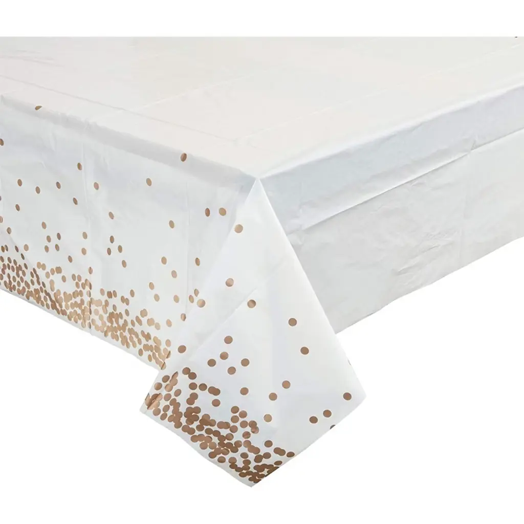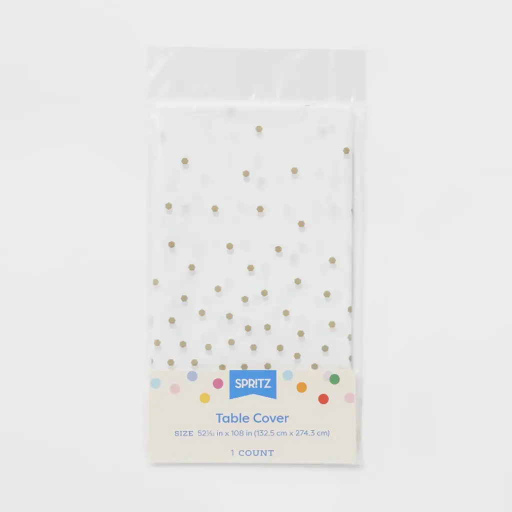 Get your table ready for your next party with this Gold Confetti Print Rectangular Table Cover from Spritz™. This table cover offers you a base to set the table for any parties while ensuring it stays protected from spills or stains. With simplistic white design and gold dot prints, this table cover adds a pop of elegance to your celebrations. Pair it with colorful dinnerware, tableware and napkins to create an elegant display.Spritz™: Pops of joy that make the moment™