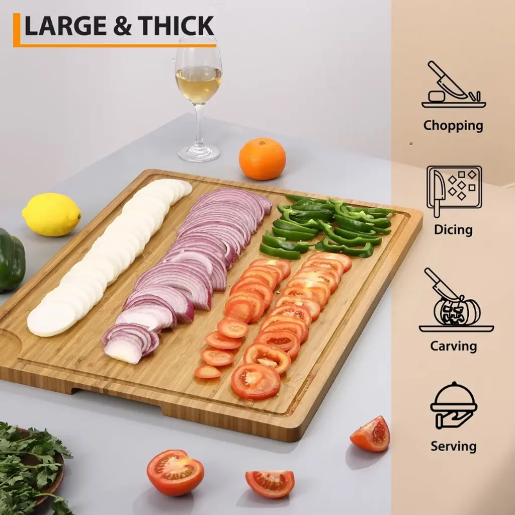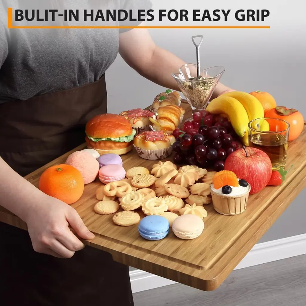 This extra-large 30" x 20" bamboo cutting board offers ample workspace for chopping, slicing, and carving, while its sturdy construction also functions as a stovetop cover or kneading board. Easy to clean and maintain with simple hand washing and periodic oiling, it features a deep juice groove and ergonomic handles for practicality. The reversible dual-surface design allows separation of raw and cooked foods or use as a stylish serving tray. Durable and versatile, this bamboo board is perfect for various kitchen tasks and adds both function and style to your cooking space.