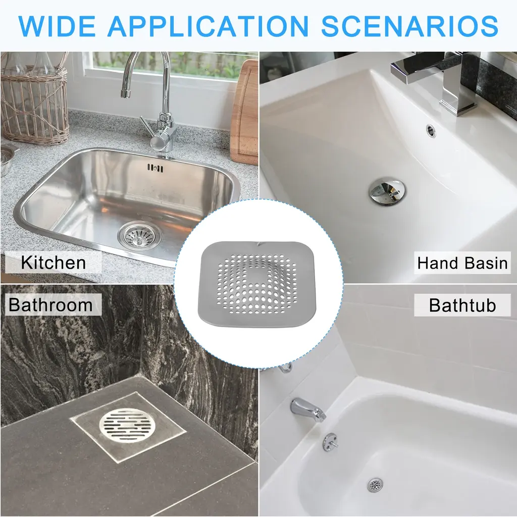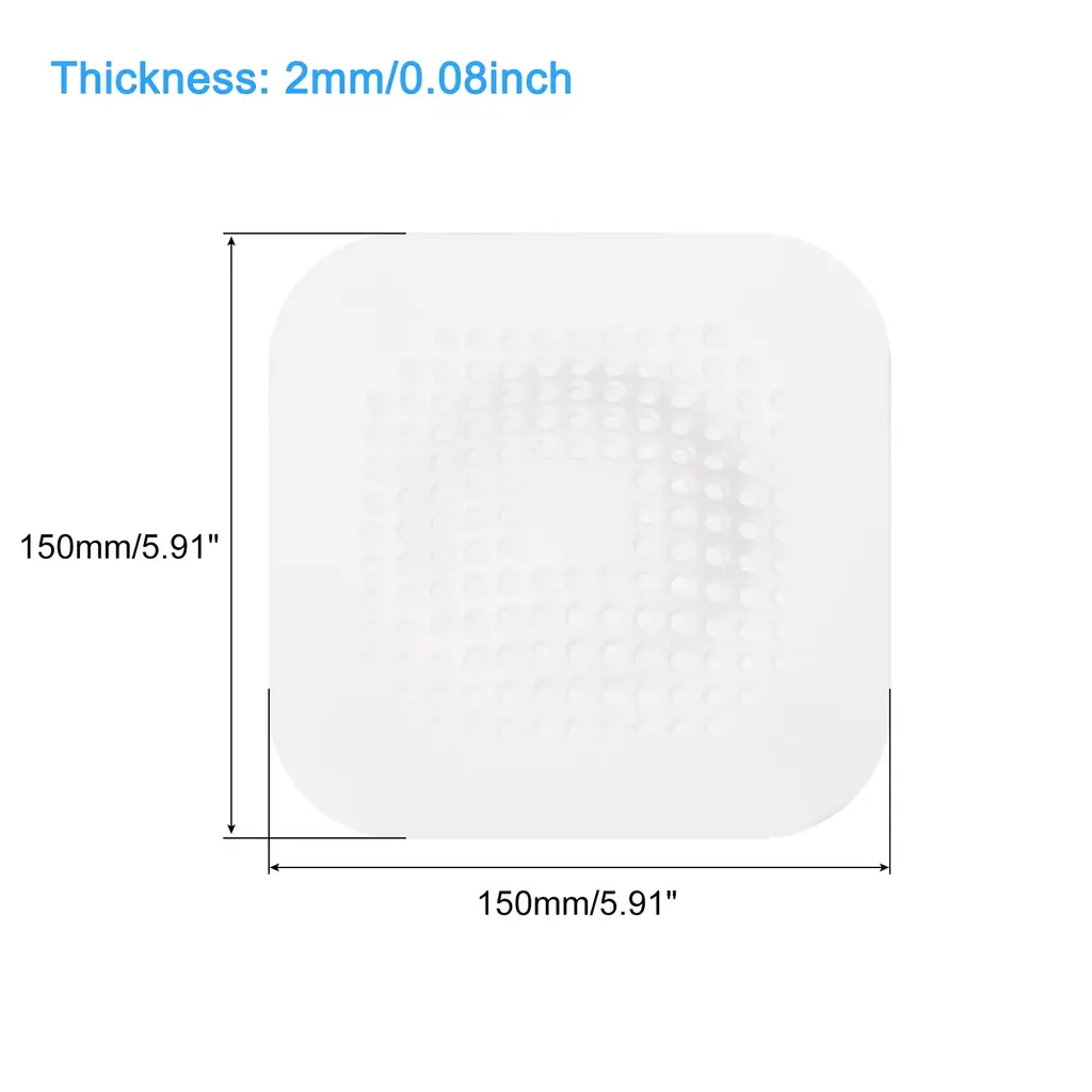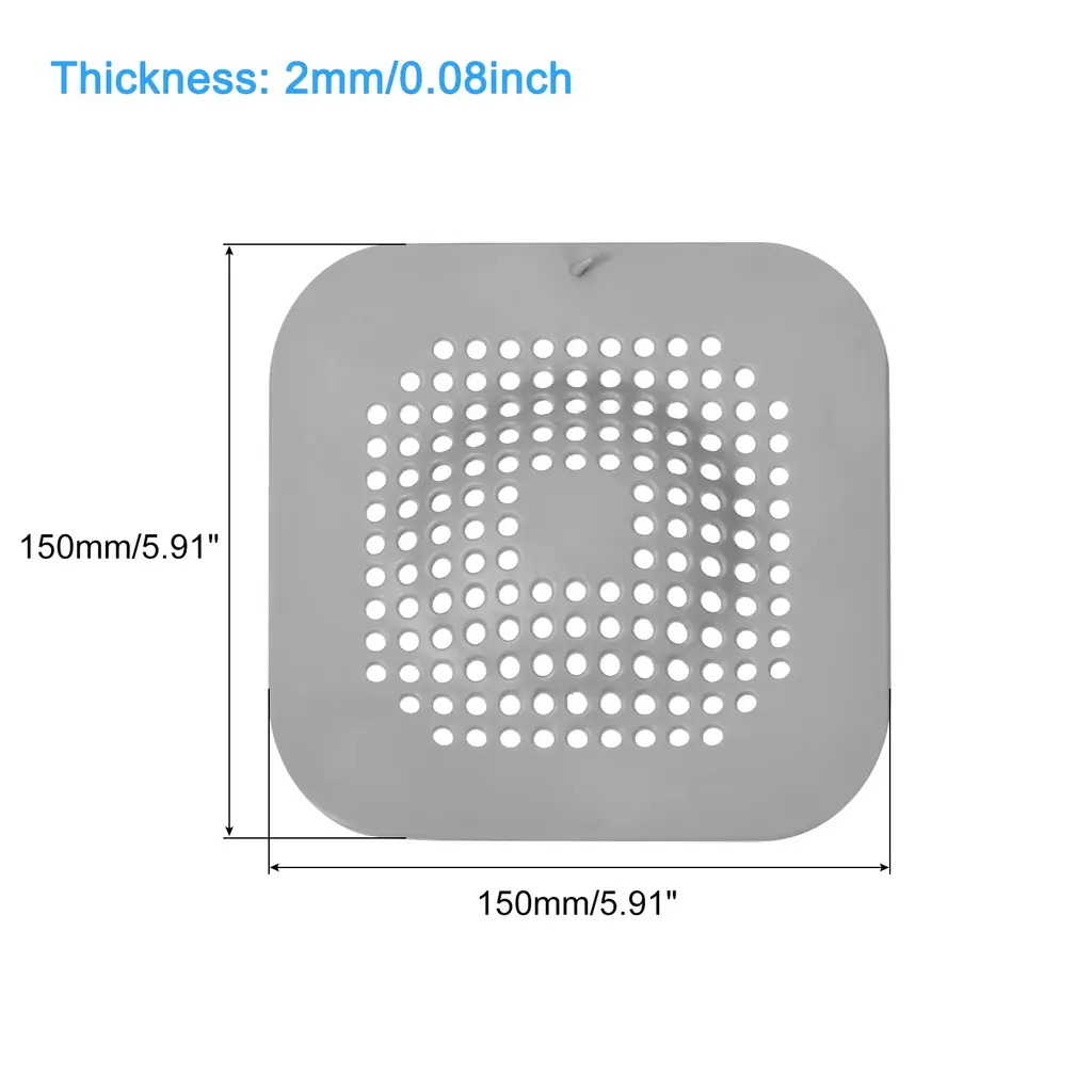 Description1. Material: Our floor drain cover is made of thermoplastic elastomer, which is very durable and anti-slip, there is no odor and no need to worry about deformation. It is very soft and can be adapted to every corner, covering the water-sink and floor drain well, and can be used repeatedly.2. Wide Application: These bath hair drain mats fit appropriately in every corner and cover the drain opening. They can be widely used in kitchens, bathrooms, balconies, etc. It can block tiny debris and hair very well, and can also prevent bad smell from overflowing from the water-sink or drain.3. Easy to Clean and Store: Place the hair catcher on the corresponding water-sink and drain, then press the suction cup to stick to the surface. When not in use, you can attach it to the wall next to the water-sink or drain. It's very easy to clean, you only need to rinse it with the faucet, it dries quickly and is easy to store.4. Strong Suction Power: The water-sink drain stopper is designed with suction cup, which is strong adsorption force, it can be stably adsorbed on the water-sink, drain or floor, making it difficult to move and prevent slipping. Multiple drainage holes prevent clogging, filter debris, and facilitate the disposal of hair and residue.SpecificationMaterial: TPEOverall Size: 150 x 150mm/5.91 x 5.91inch(L*W)Thickness: 2.2mm/0.09inchColor: GreyShape: SquareStyle: ModernPackage Listing4pcs x Hair Drain Catchers