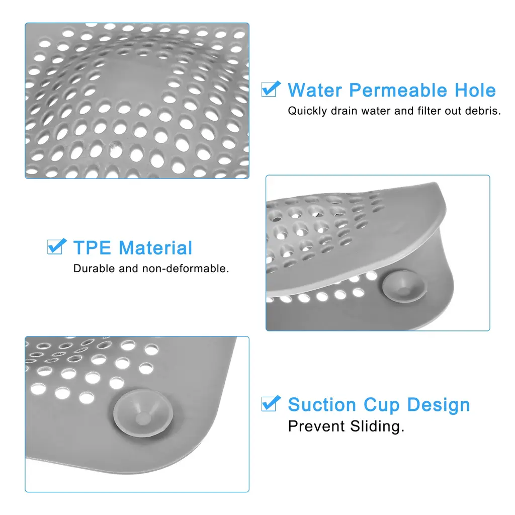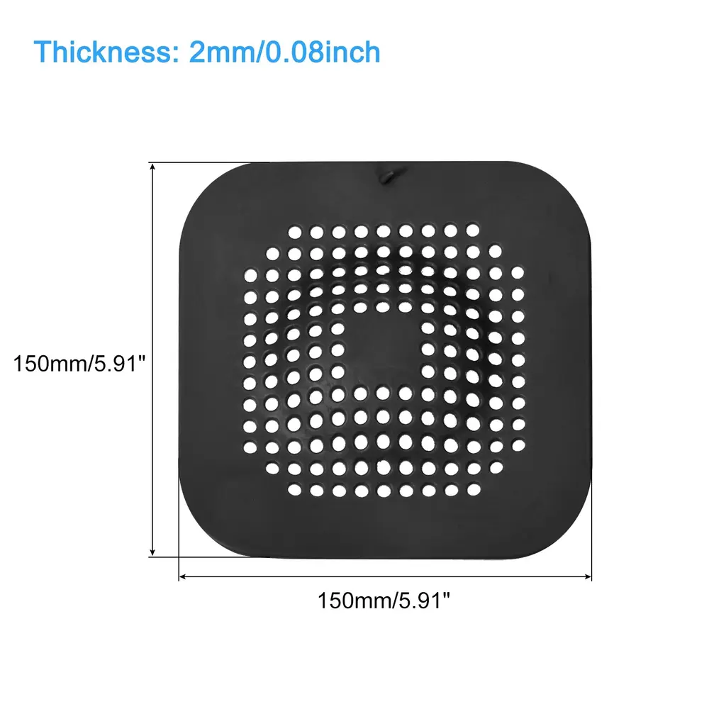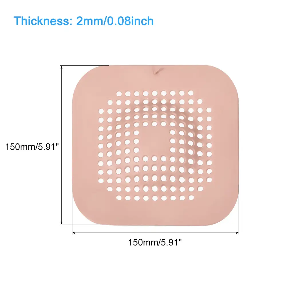 Description1. Material: Our floor drain cover is made of thermoplastic elastomer, which is very durable and anti-slip, there is no odor and no need to worry about deformation. It is very soft and can be adapted to every corner, covering the water-sink and floor drain well, and can be used repeatedly.2. Wide Application: These bath hair drain mats fit appropriately in every corner and cover the drain opening. They can be widely used in kitchens, bathrooms, balconies, etc. It can block tiny debris and hair very well, and can also prevent bad smell from overflowing from the water-sink or drain.3. Easy to Clean and Store: Place the hair catcher on the corresponding water-sink and drain, then press the suction cup to stick to the surface. When not in use, you can attach it to the wall next to the water-sink or drain. It's very easy to clean, you only need to rinse it with the faucet, it dries quickly and is easy to store.4. Strong Suction Power: The water-sink drain stopper is designed with suction cup, which is strong adsorption force, it can be stably adsorbed on the water-sink, drain or floor, making it difficult to move and prevent slipping. Multiple drainage holes prevent clogging, filter debris, and facilitate the disposal of hair and residue.SpecificationMaterial: TPEOverall Size: 150 x 150mm/5.91 x 5.91inch(L*W)Thickness: 2.2mm/0.09inchColor: GreyShape: SquareStyle: ModernPackage Listing4pcs x Hair Drain Catchers