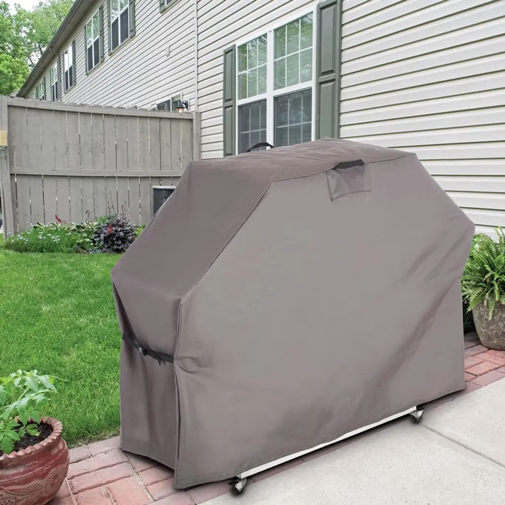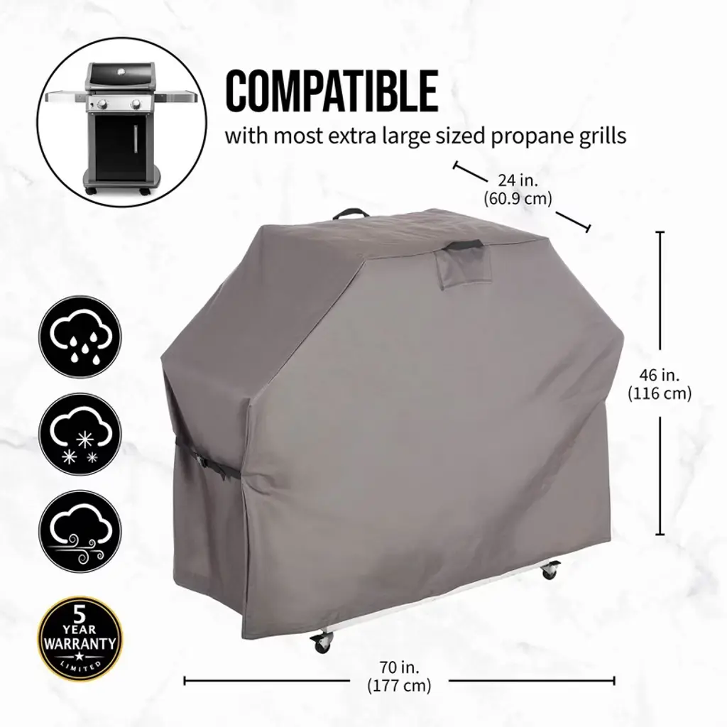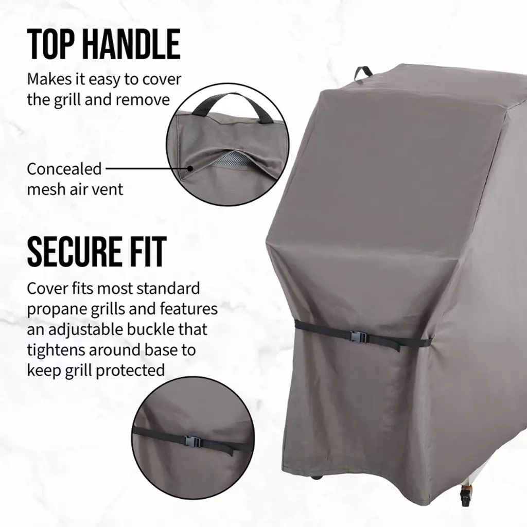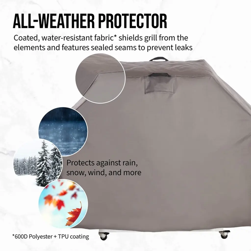 Protect your grill from the elements with the Hoan BBQ Extra Large Grill Cover, designed to safeguard your investment with all-weather protection and durability. Crafted from 600D polyester with a TPU coating, this water-resistant grill cover is engineered to endure the harshest weather conditions, from heavy rain and snow to scorching sun and freezing winds. The innovative sealed seam prevents leaks, ensuring that your grill stays dry and protected, no matter the forecast. This BBQ grill cover features a top handle for easy placement and removal, allowing you to effortlessly cover and uncover your grill without hassle. Whether you're preparing for a cookout or tucking your grill away for the season, the sturdy handle makes managing the cover simple and stress-free. A secure fit is critical for proper grill protection, and the adjustable buckle at the base of this cover ensures that your grill remains shielded, even during windy weather. The buckle cinches tightly around the grill’s base, providing a snug and secure fit that stays in place when you need it most. Designed to fit most extra large propane grills, this universal grill cover offers versatile protection for various brands and models. Whether your grill is out in the elements year-round or only used seasonally, this outdoor grill cover is built to keep it safe from dirt, dust, and weather damage, allowing you to enjoy a clean and ready-to-use grill every time. Protect your grill, extend its lifespan, and maintain its condition with the reliable Hoan BBQ Extra Large Grill Cover.
