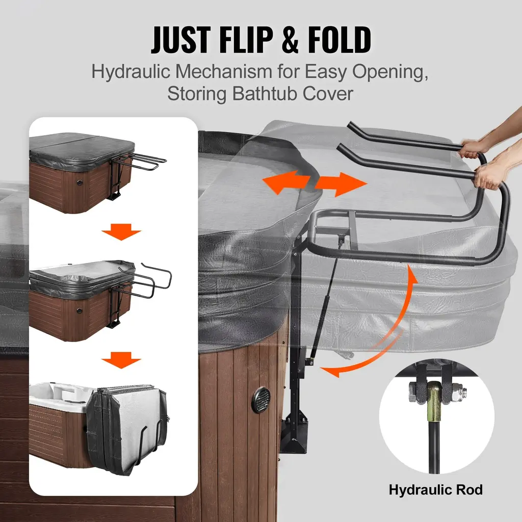Easy to Open Hot Tub Cover: Moving your hot tub cover is too much work! This lift with hydraulics allows you to open, store and close your hot tub cover with less effort, all you have to do is flip and fold! It doesn't take up space around your hot tub, making it an excellent choice for homes and spas. Fits Most Hot Tubs: If your tub has plenty of space on one side and under the counter, this lift is perfect for you. It is suitable for rectangular tubs with a length of 74.8" - 98.4" / 1900 - 2500 mm, a width of 53.1" - 92.5" / 1350 - 2350 mm and a height of 33.1" - 41.3" / 840 - 1050 mm. Sturdy & Durable Lift: Made of durable black powder-coated aluminum alloy tubing, this material has high strength to withstand large loads while maintaining its lightweight characteristics. It reduces the likelihood of rusting over time and also provides ample and reliable support for your bathtub cover. Adjustable Design: The U-shaped arms are adjustable so that you can decide how high to place the folding cover when it is opened for more freedom of choice. We also made the bracket with anti-sharp edge treatment, no matter where you touch the lift, it won't scratch. Easy To Install: This hot tub cover lift needs to be installed on the floor, you can follow the instructions step by step to assemble it quickly. It should be noted that we need to leave space for the bathtub cover when in use, rear: >35.4" / 900 mm This will ensure that your lift can be used smoothly. Package Content 2 x Curved Pipes 1 x Main Frame 2 x Square Tube Columns 1 x Aluminum Plate 1 x Right-Angle Piece 2 x Countersunk Self-Tapping Screw 5×50 (4+2) x Countersunk Self-Tapping Screw 5×30 (6+2) x Countersunk Self-Tapping Screw 5×20 6 x Countersunk Screw M8×16 6 x M8 Screw Caps (10+4) x Screw Caps 6 x M8 Washers 1 x Wind Batch Head 1 x Φ3.2 Drill Bit 1 x Hex Key 1 x Instruction Manual * "+" indicates additional accessories