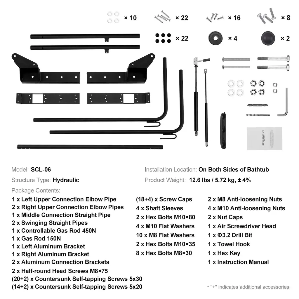 Easy to Open Hot Tub Cover: Moving your hot tub cover is too much work! This lift with hydraulics allows you to open, store and close your hot tub cover with less effort, all you have to do is flip and fold! It doesn't take up space around your hot tub, making it an excellent choice for homes and spas. Fits Most Hot Tubs: If you have obstacles under your rectangular hot tub counter and want the lift to be super stable, then this one is perfect for you! With more even support on both sides, the lift can hold more weight for tubs of all sizes. Rectangular bathtubs with a length of 74.8" - 98.4" / 1900-2500 mm, a width of 69" - 96.5" / 1750 - 2450 mm and a radius of the rounded corners of the bathtub of 6" - 11.8" / 150 - 300 mm are suitable. Take care to measure the radius at the widest point of the rounded corner. Round each measurement to the nearest half-inch. Sturdy Lift: Made of durable black powder-coated aluminum tubing, this material has high strength to withstand large loads while maintaining lightweight characteristics. It reduces the likelihood of rusting over time and also provides ample and reliable support for your bathtub cover. Convenient Detail Design: This hot tub cover lift is added with a self-locking position function to prevent the cover from falling down due to the failure of the hydraulic lever; three hooks are designed on the side of the bracket, which makes it easy to put towels and clothes when you are using it; we also made the bracket with an anti-sharp edge treatment, so that it won't be scratched no matter where you touch the lift. Easy To Install: When installing, you need to make sure both sides of the mounting position are symmetrical, you can follow the instructions step by step to assemble quickly. It should be noted that we need to leave space for the bathtub cover when in use, rear: >21" / 500 mm, both sides: >5.5" / 130 mm, so as to ensure that your lift can be used smoothly. Package Content 1 x Left Upper Connection Elbow Pipe 2 x Right Upper Connection Elbow Pipes 1 x Middle Connection Straight Pipe 2 x Swinging Straight Pipes 1 x Controllable Gas Rod 450N 1 x Gas Rod 150N 1 x Left Aluminum Bracket 1 x Right Aluminum Bracket 2 x Aluminum Connection Brackets 2 x M8 Anti-loosening Nuts (18+4) x Screw Caps (20+2) x Countersunk Self-tapping Screws 5x30 (14+2) x Countersunk Self-tapping Screws 5x20 4 x Shaft Sleeves 2 x Hex Bolts M10×80 4 x M10 Flat Washers 10 x M8 Flat Washers 2 x Hex Bolts M10×35 8 x Hex Bolts M8×30 2 x Half-round Head Screws M8×75 4 x M10 Anti-loosening Nuts 2 x Nut Caps 1 x Air Screwdriver Head 1 x Φ3.2 Drill Bit 1 x Towel Hook 1 x Hex Key 1 x Instruction Manual * "+" indicates additional accessories