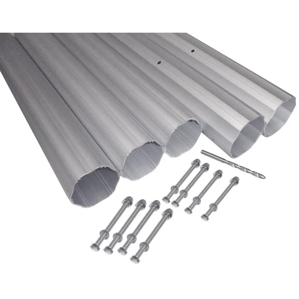 This heavy duty aluminum tube kit is intended for use with standard weight solar covers. Product Features: Fits pools up to 24' across Designed for use with item 50050 reel system (sold separately) Tube kit includes: (2) 68" x 2.92" hexagonal extruded aluminum shafts (3) 68" x 2.75" hexagonal extruded aluminum shafts (8) through bolts (1) drill bit (2) 24" storage straps (2) wood screw storage hooks Material(s): aluminum Note: tube kit only - reel system is not included