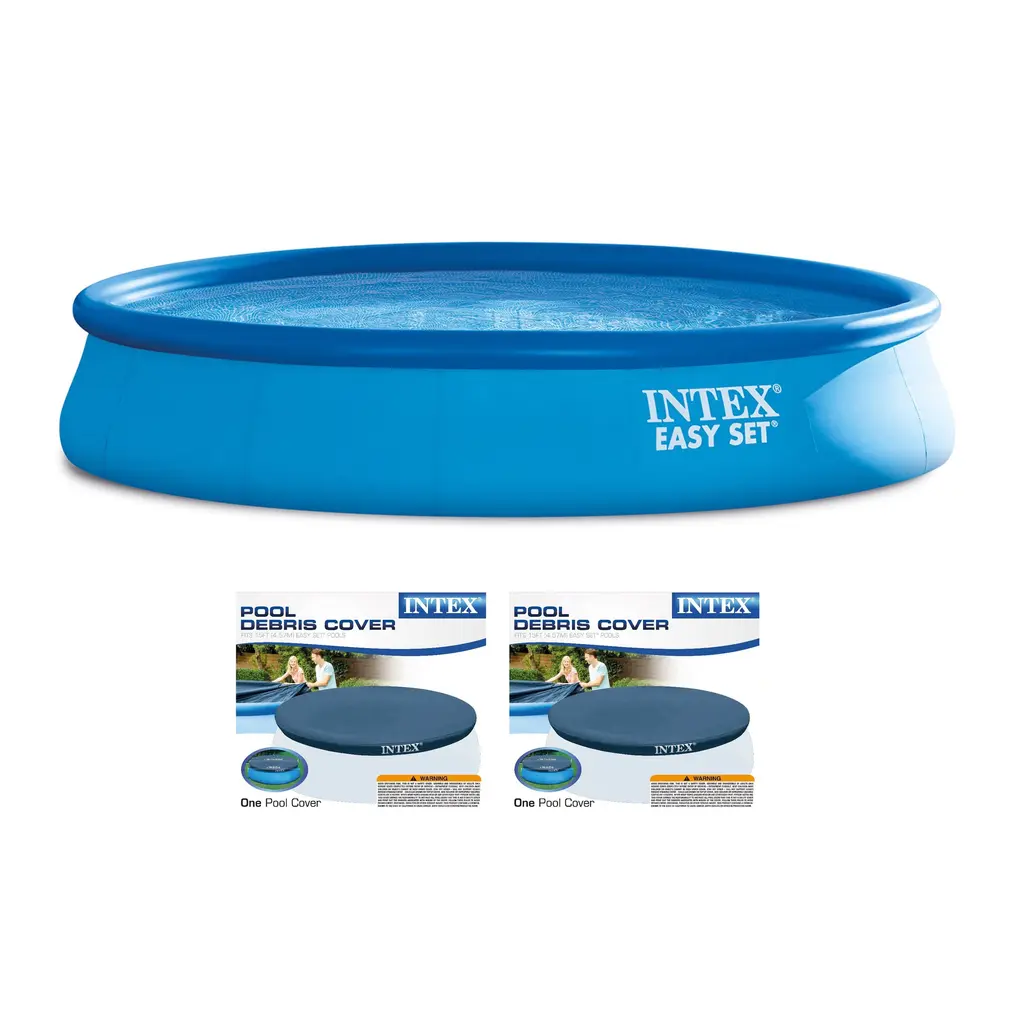 This Intex 15ft x 33in Easy Set Inflatable Swimming Pool will give your friends and family infinite hours of refreshing, fun activity and enjoyment. This pool comes with a 15-Foot Easy-Set Pool Cover (2-pack). Included with your Easy Set swimming pool is a 530 GPH Krystal Clear cartridge filter pump to help keep your pool clean all summer long. Intex Easy Set pools are much simpler and easier to assemble and disassemble than any rigid steel-walled pool. This pool will make your backyard the place to be all summer as your family can relax and play. You could be ready for cool water in as little as 15 minutes. The 30-gauge sidewalls are made with 3 separate layers of material for extra strength and durability. This pool will resist even the roughest treatment. The drain plug accepts a garden hose to drain water away from the pool area as desired Intex 15' x 33" Easy Set Above Ground Swimming Pool & 530 GPH Filter Pump and 15-Foot Easy Set Swimming Pool Debris Vinyl Cover Tarp (2-pack) Your kids will want to splash the day away in this above-ground swimming pool Round 15ft x 33in pool is the perfect size for backyard fun Krystal Clear cartridge filter pump is included and is easy to install 30-gauge sidewalls made with 3 separate layers of material for extra strength and durability Super-easy setup means pool is ready for water in as little as 15 minutes The drain plug accepts a garden hose to drain water away from the pool area as desired Much easier to disassemble than any rigid steel walled pool so you can store your Easy Set Pool during the off-season and extend your pool's life indefinitely Includes: Pool, pump, filter, and instructional DVD Pool type: Inflatable Material: PVC plastic Height: 33 inches Diameter: 15 feet Capacity: 8 people Capacity: 2,587 gallons of water Space required: 289 square feet Color: Blue Dimensions (L x W x H): 180 x 180 x 30 inches