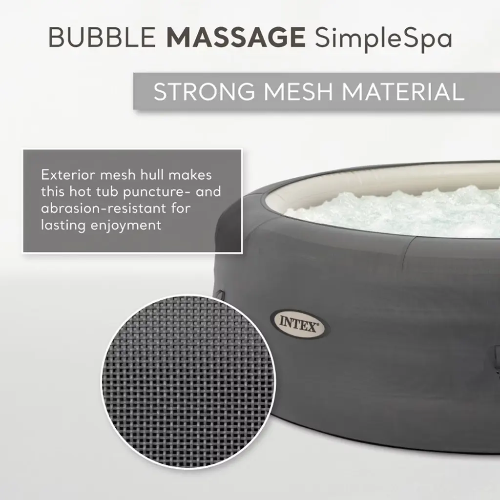 Let your worries bubble away and unwind in the Intex SimpleSpa Bubble Massage Inflatable Hot Tub for ultimate relaxation. Featuring 140 soothing bubble jets that surround the interior of the spa, this outdoor hot tub provides an ideal and refreshing massage. Designed with a compact control unit, you can adjust the heating system to ensure the water temperature fits your personal preference. While relaxing, make sure your belongings are kept safe but still within arm's reach with the built-in cup holder. The easy-to-inflate hot tub is protected by the exterior mesh hull, while the included insulated cover and ground cloth helps minimize heat loss, so the spa is always ready when you are. With the floating chemical dispenser, 2 easy-to-replace filter cartridges, and touch-button controls, enjoying and maintaining a hot tub has never been simpler. With the energy efficient cover, your spa has extra insulation to minimize heat loss. The cover enhances spa performance while improving energy efficiency up to 50 percent. Measuring 85 inches in diameter and 26 inches tall, this round outdoor hot tub is made to accommodate people comfortably. Enjoy feeling refreshed with the SimpleSpa Bubble Massage Inflatable Hot Tub from Intex.