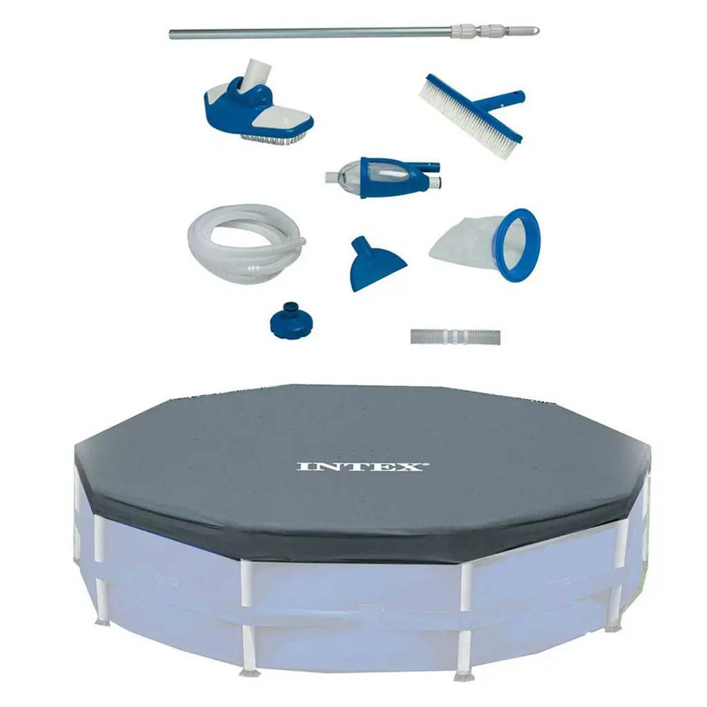 Intex Deluxe Maintenance Cleaning Kit & 12-Foot Round Frame Easy Set Pool Cover - 7.62 - Blue - 7.62