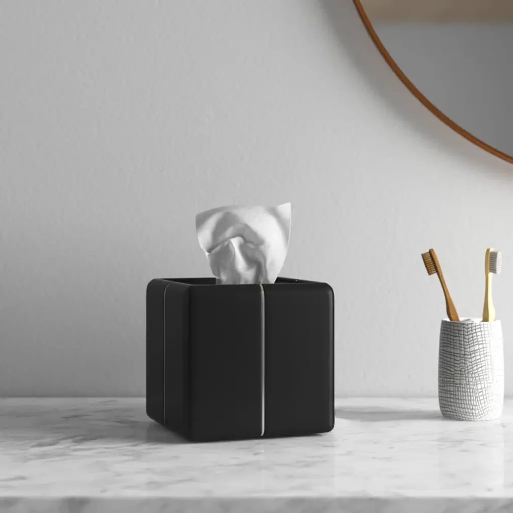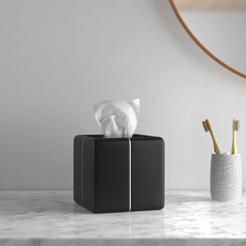 Smooth out your space. This square tissue box cover conceals unsightly cardboard while its minimal lines bring an uncluttered look to your bathroom counters. It’s crafted from water-resistant stoneware with a smooth black finish and embellished with painted white stripes.