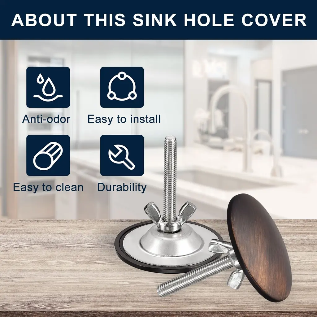 Description-The sink hole plug is not only suitable for sinks in ordinary household kitchens, but also can be applied to various types of sinks in public places, catering field, etc., and has wide applicability.-Made of zinc alloy, this kitchen sink cover fits 6-45mm/0.24 - 1.77-inch sink holes. Its surface has been plated to make it smooth, and beautiful, and has a long service life.-In addition, the sink cover is simple and convenient to install can be quickly installed on your sinks without the assistance of other tools, and can be easily removed and cleaned. Before use, please confirm the installation hole diameter of the sinks, and avoid using objects to scratch or damage the surface treatment, so as not to damage the surface treatment effect.FeatureOverall Size: 50 x 58 mm/1.97 inch x 2.28 inchSuitable Aperture: 6-45mm/0.24-1.77 inchThread Length: 40mm/1.57 inchThread Specifications: M6*1.0Material: Zinc AlloyNut Material: 304 Stainless SteelSurface Treatment: PlatedShape: RoundColor: BronzePackage Including 1 x Kitchen Sink Hole Covers