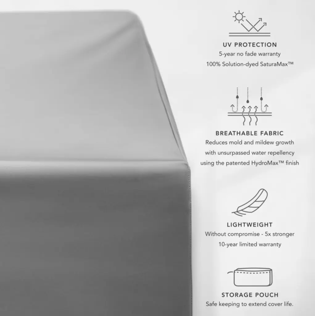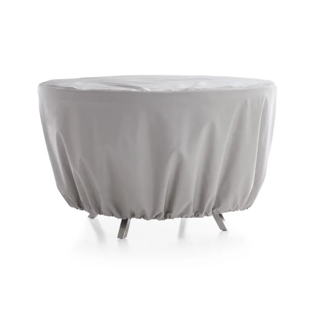 Keep your round outdoor dining table in its best shape with this cover uniquely woven to resist abrasion and fading. The breathable, water-resistant fabric protects a table from precipitation while allowing condensation to evaporate. Saturation-dyed a sophisticated shade of grey, the Saturamax fabric boasts UV protection to retain its hue for five years. Safety stitches and binding along the edges ensure durability. Lightweight and easy to put on and take off thanks to its drawstring closure, the KoverRoos®MAX round outdoor dining table cover stores neatly in the included pouch.