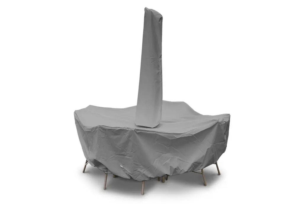 The KoverRoos®MAX Oval/Rectangle Dining Set Cover with Umbrella Hole is the perfect solution to protect your outdoor dining set. Made from durable light grey polyester, this cover is designed to withstand the elements and keep your furniture looking new. Its eco-friendly construction ensures that you are making a sustainable choice for your outdoor space.
