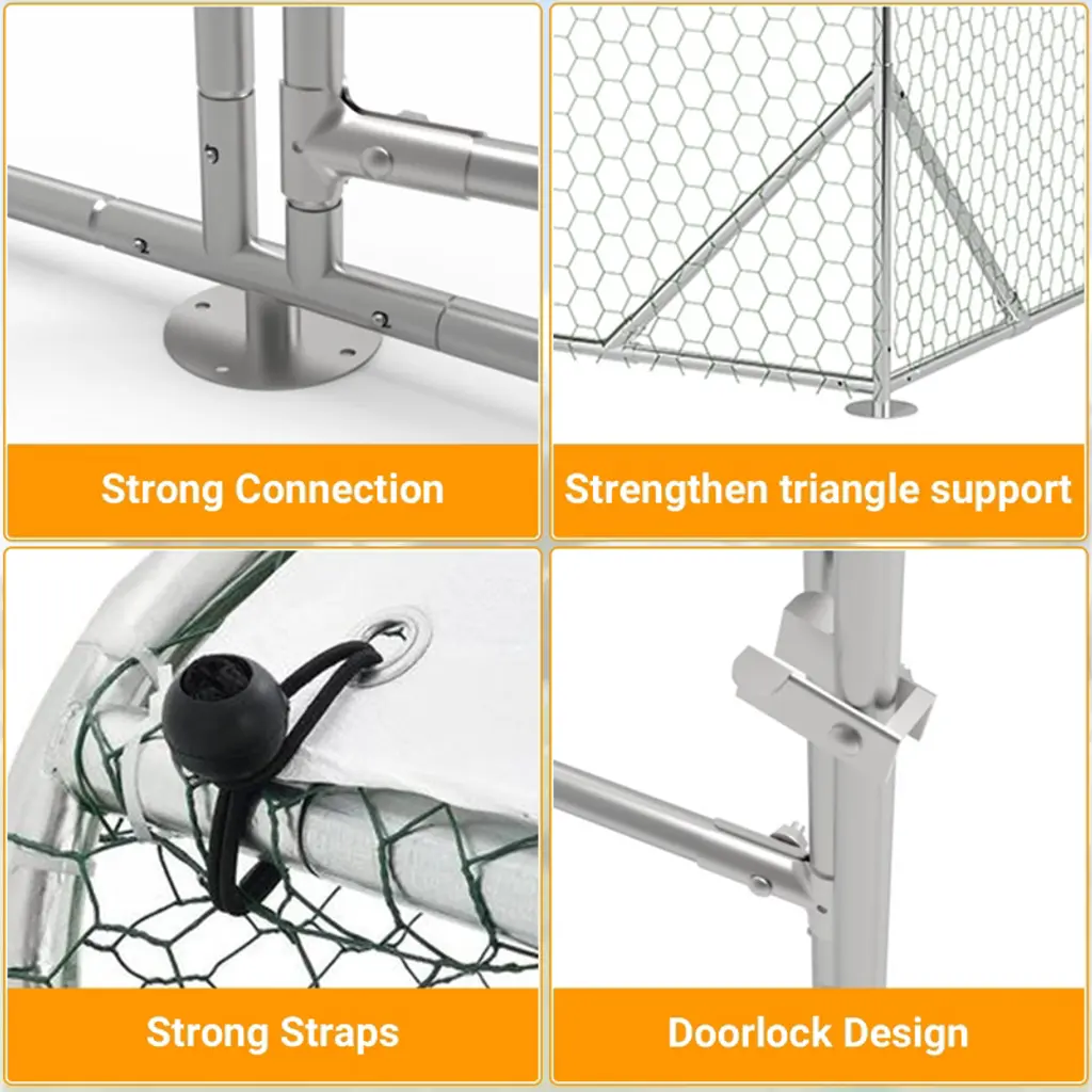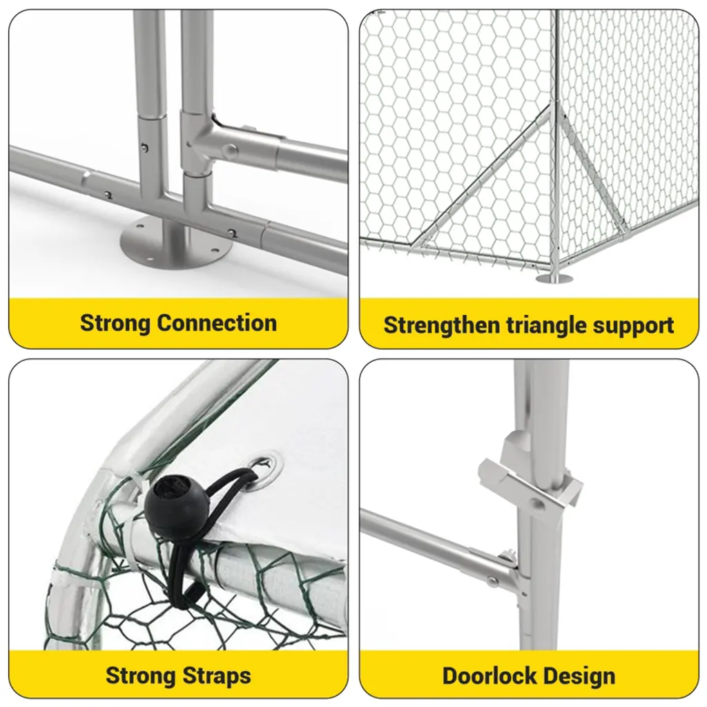 Product informationItem Weight: 97.2 poundsColor: SilverSize:9.8 x 19.7 x 6.6FtBreed Recommendation: Chickens, ducks, geese, dogs, and other small animalsIncluded Components: StandSpecific Uses for Product: OutdoorProduct DescriptionLarge Metal Chicken Coop Upgrade Tri-Supporting Wire Mesh, Walk-In Poultry Cage, Chicken Run Pen House with Waterproof & Anti-Ultraviolet Cover & Lockable Doors for Outdoor 9.8 x 6.5x 6.5Ft【STRONG STEEL CONSTRUCTION】Built with a high-quality galvanized steel frame and reinforced with extra support posts with triangular brackets, this chicken coop ensures unmatched stability for long-term outdoor use. The stainless steel plus corrosion-resistant coating protects against rust, even in harsh weather, making it ideal for farms or backyards.【SAFETY COATED WIRE MESH】The PVC-coated hexagonal wire mesh of the chicken house prevents escapes while maximizing ventilation, creating a healthy habitat for your pets. Small gaps between the wires add security, keeping predators out and ensuring your chickens, rabbits, or ducks stay safe.【420D WATERPROOF & UV-RESISTANT COVER】The 420D Oxford fabric roof provides full protection from sun, rain, snow, and frost. Its sloping design ensures water, debris, and light snow drain smoothly, preventing accumulation and extending the duck coop’s lifespan. Your pets stay dry and comfortable year-round!【EASY INSTALLATION WITH IMPROVED DESIGN】Each component of our chicken runs is numbered for hassle-free assembly, and the step-by-step instructions save you time. We’ve upgraded pole connections for a smoother, wobble-free setup—perfect for DIY beginners or busy pet owners.【MULTI-ANIMAL COMPATIBILITY & SPACIOUS】Measuring generous dimensions, this outdoor chicken coop offers ample space for small/medium pets like chickens, rabbits, ducks, cats, dogs, sheep, birds, or terrapins. The walk-in design makes cleaning and feeding easy, while the sturdy structure ensures long-lasting use.