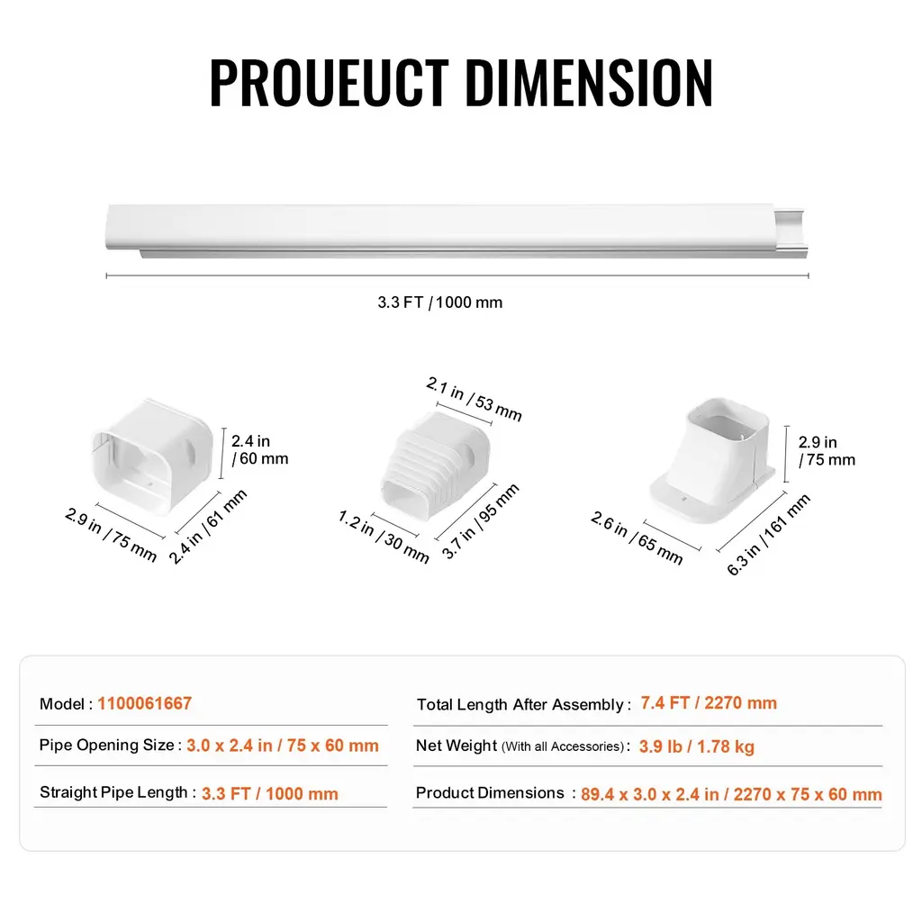 Accurate Measurement Before Purchasing: To avoid size errors after purchase, all components have been precisely measured. It is recommended to measure the distance and mark the installation route before purchasing. After measurement, you can select the appropriate size according to your needs. Turn Clutter Into Neatness: The total length after assembling all components is 10.2FT / 7.4FT / 17.7FT , suitable for various split air conditioning pipelines. It can also be cut according to actual needs. Complete Accessories & Easy Installation: Apart from the free joint, each component is divided in the middle for effortless integration with any prior or existing setup. Each straight pipe measures 3.3FT( 7.4FT option) / 1.5FT(10.2FT option) / 17.4in(17.7FT option), featuring a snap-in design for swift installation. The comprehensive accessory set ensures a professional finish for every system. Premium Material & Ultra Durable: Our lineset cover is made of special high-grade PVC+PE, which protects the pipeline from natural factors by virtue of excellent impact resistance and weather resistance. It is not prone to aging even with prolonged use.Optimal Wire Group Protection Solution: Properly storing and safeguarding the refrigerant AC pipeline is crucial for extending the lifespan of air conditioning units. Our line set cover is excellently tailored for both small split and traditional air conditioner systems, ensuring optimal protection and longevity for your equipment. 10.2FT Package Content Straight Pipes x 5 Swivel Joint x 1 Straight Pipe Joint x 4 Pipe End Cap x 1 Wall Penetration Guard (90°) x 1 Horizontal Bending x 1 Vertical Bending x 1 ST3.5 x 16 Screws x 19 ST4 x 25 Screws x 12 Cable Ties x 12 User Manual x 1 7.4FT Package Content Straight Pipes x 2 Wall Penetration Guard (90°) x 1 Straight Pipe Joint x 1 Pipe End Cap x 1 ST3.5 x 16 Screws x 8 ST4 x 25 Screws x 5 Cable Ties x 5 User Manual x 1 17.7FT Package Content Straight Pipes x 10 Swivel Joint x 1 Straight Pipe Joint x 9 Pipe End Cap x 1 Horizontal Bending x 1 Vertical Bending x 1 Wall Penetration Guard (90°) x 1 Wall Penetration Guard (Straight) x 1 ST3.5 x 16 Screws x 30 ST4 x 25 Screws x 19 Cable Ties x 22 User Manual x 1
