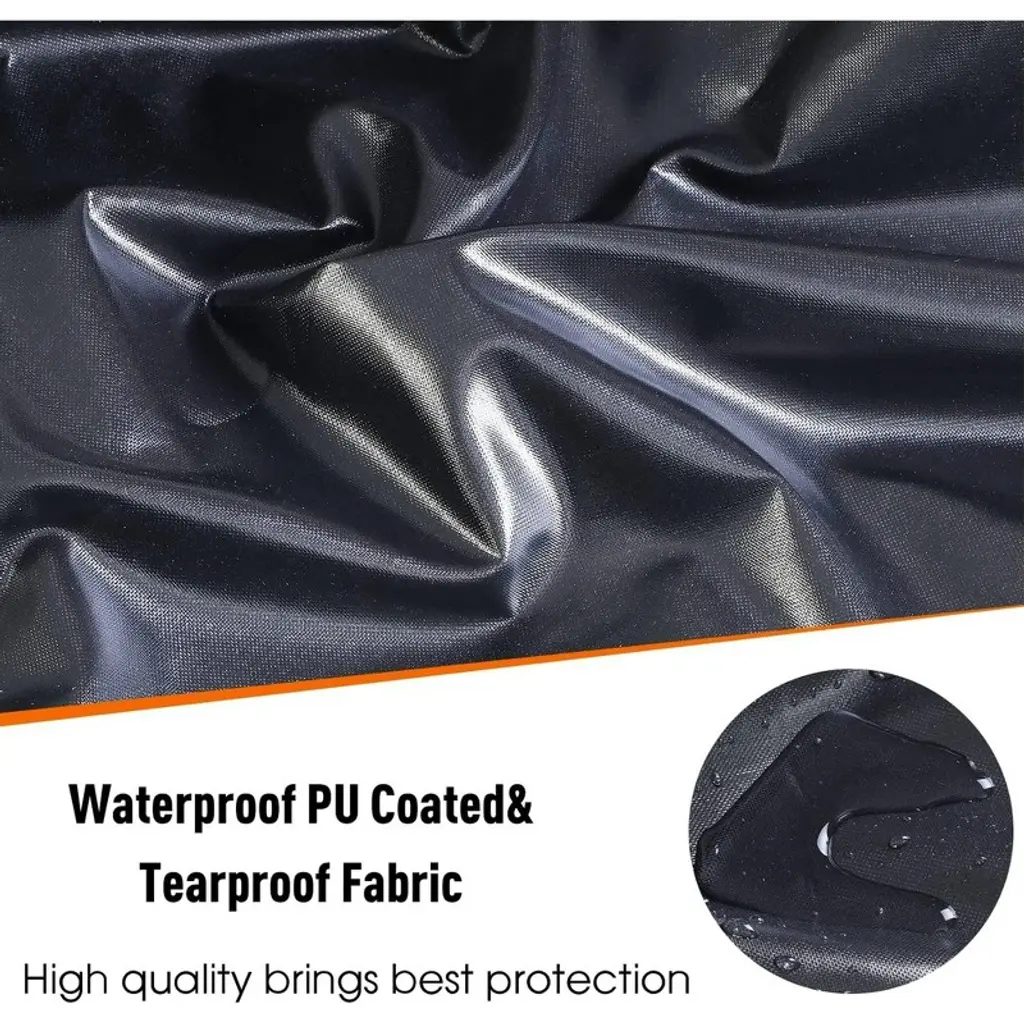 This patio furniture cover fits most furniture such as coffee tables, benches, coffee tables, chairs, round or oval patio dining sets, 8-12 chairs, or 6-8 person sofa sets. Please measure the size of your furniture set before purchasing.This couch cover set made from strictly stitched 600D material and it is PU coated with waterproof tape at the seams. It keeps your furniture dry,also protects your furniture from rain, snowstorm, dust, falling leaves, scratches.