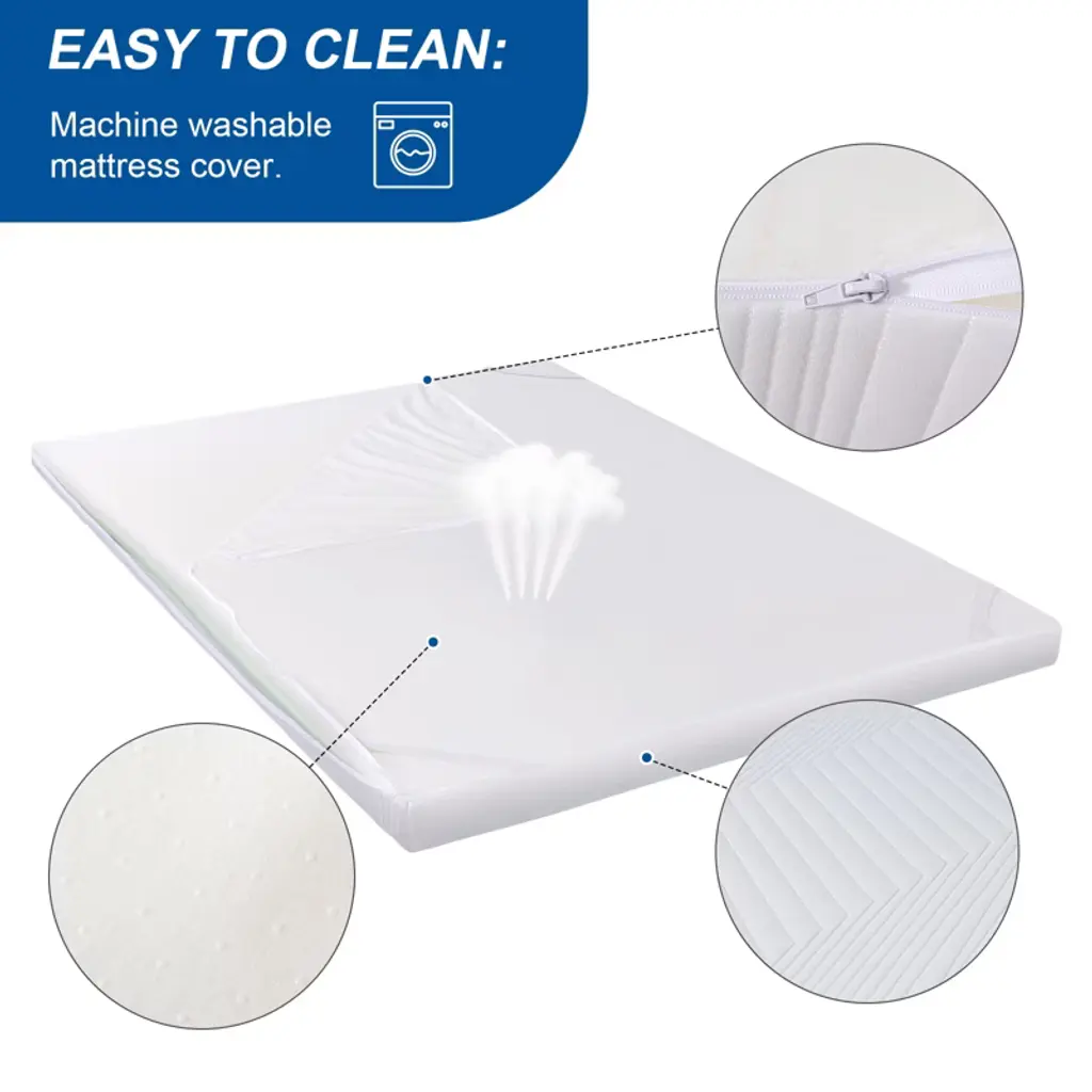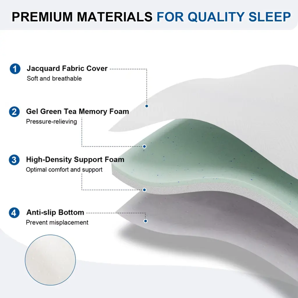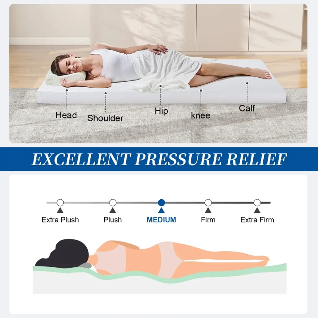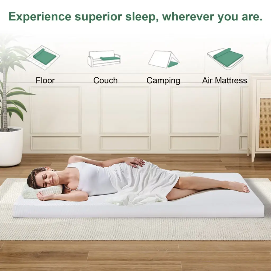 Gel Memory Foam Mattress – Cool, Supportive & Versatile Comfort Experience pressure-relieving sleep with our OEKO-TEX certified gel memory foam mattress, designed to cradle your body while dissipating heat for a cooler night's rest. The 4-inch thick adaptive foam conforms to your curves, easing back and joint pain while maintaining proper spinal alignment. Perfect for sofa beds, RVs, or floor use, this mattress features a machine-washable cover with non-slip fabric to stay securely in place. Ships vacuum-packed for easy transport—just unbox and let it expand for 24-72 hours to full plush comfort. MUUEGM:Thoughtful furniture for inspired living.
