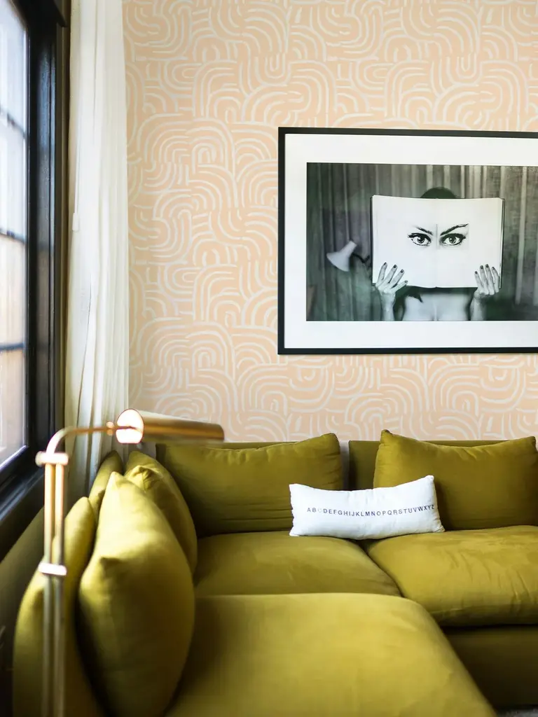 Lyrical arches create a surface of multidirectional line, color and rhythm. Mid-scale design with small elements that transform into a larger composition. Backdrop wallcoverings are made from hand-crafted artwork and printed on a non-woven ground with a subtle fibrous texture. Designed in Los Angeles and expertly printed in Brooklyn. Backdrop is proudly part of the heritage design house F. Schumacher & Co.