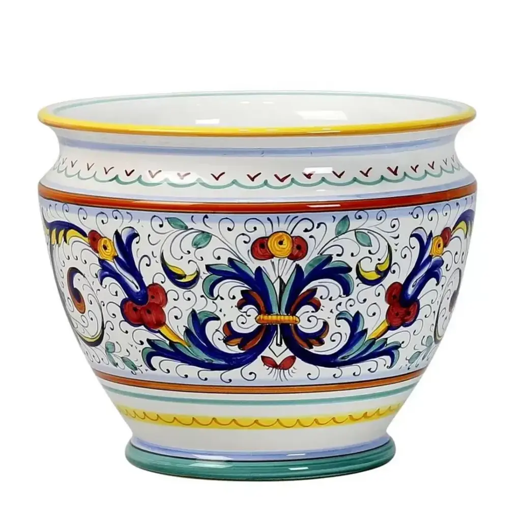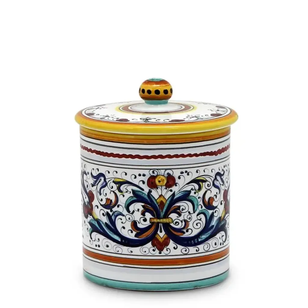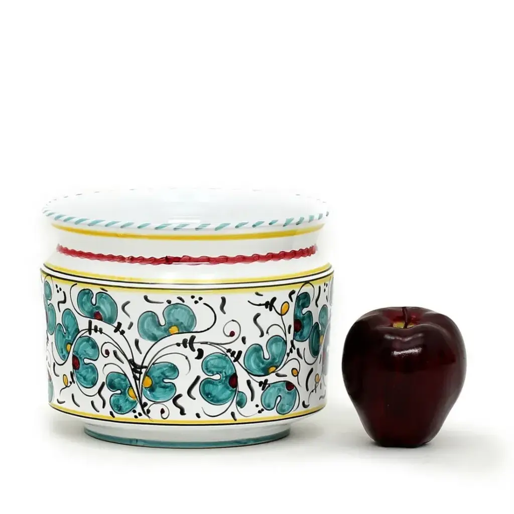 ORVIETO Green, Red, Blue Collections: The Orvieto (or Orvietano) design is a very old and traditional pattern that originated during the Renaissance in the hill-top town of Orvieto Italy. Truly one of Italy's most unique and interesting cities, Orvieto has a charming medieval character, mainly due to its celebrated Cathedral, a gem of Gothic architecture that took more than 100 years to build. The 'Galletto' (Rooster) pattern's main motif is a crowing rooster that symbolizes good wishes for blessings, prosperity and well-being. Hand made in Deruta-Italy. Size: 8 DIAM. X 6 HIGH (Inside: 6 D.X5 H.) Pure White Background