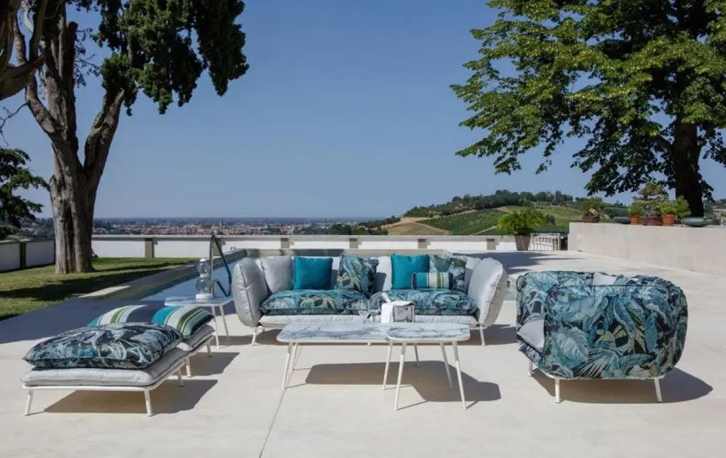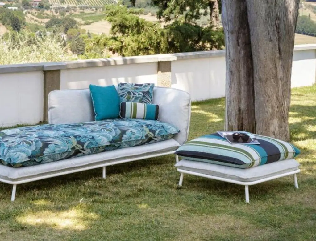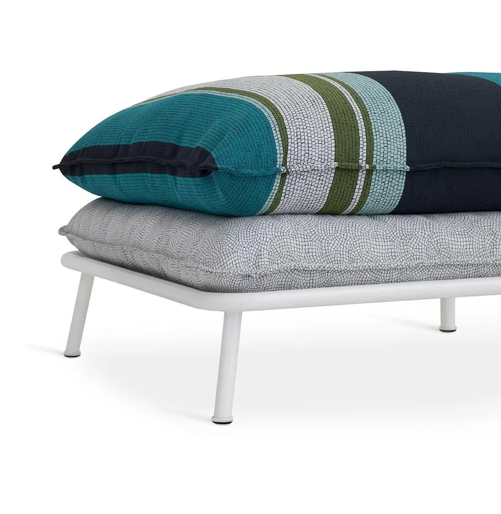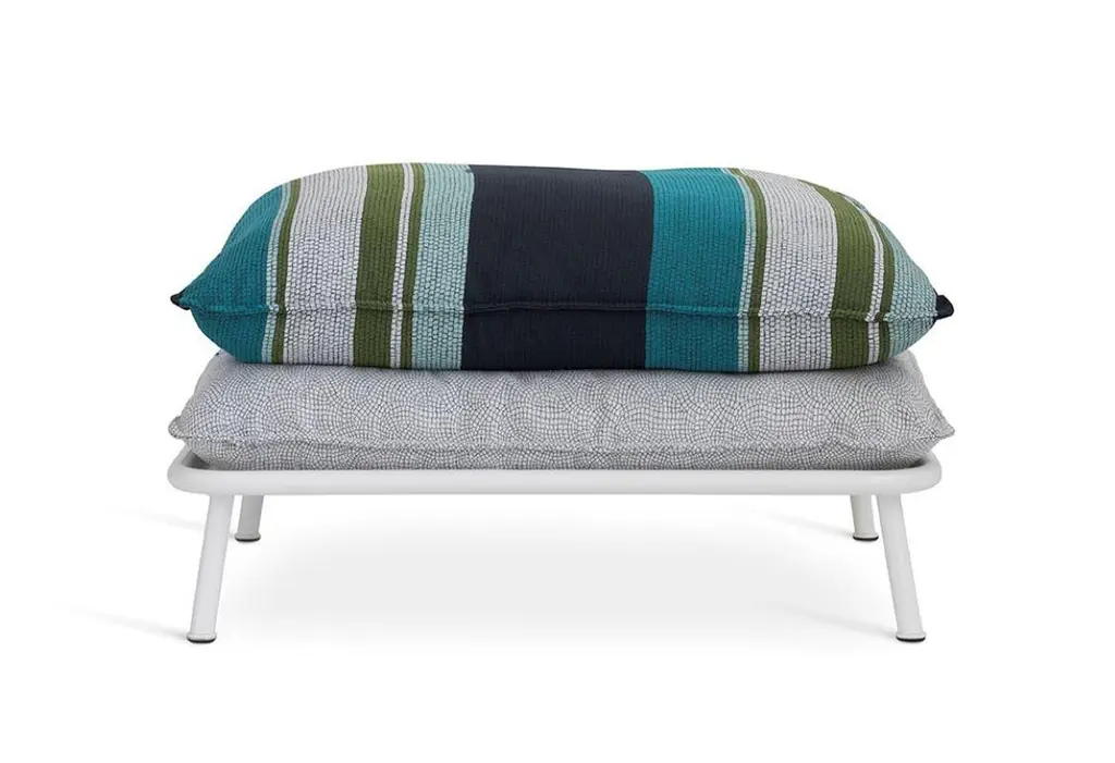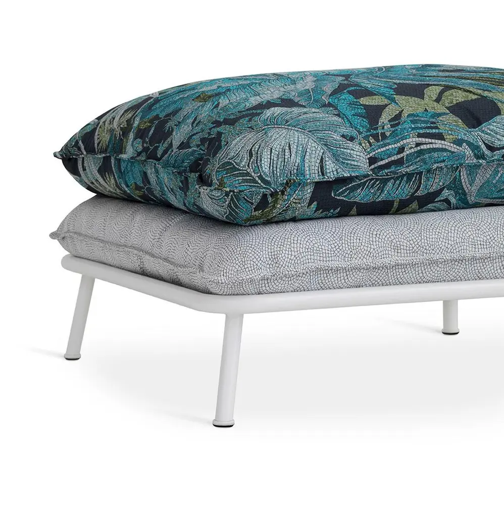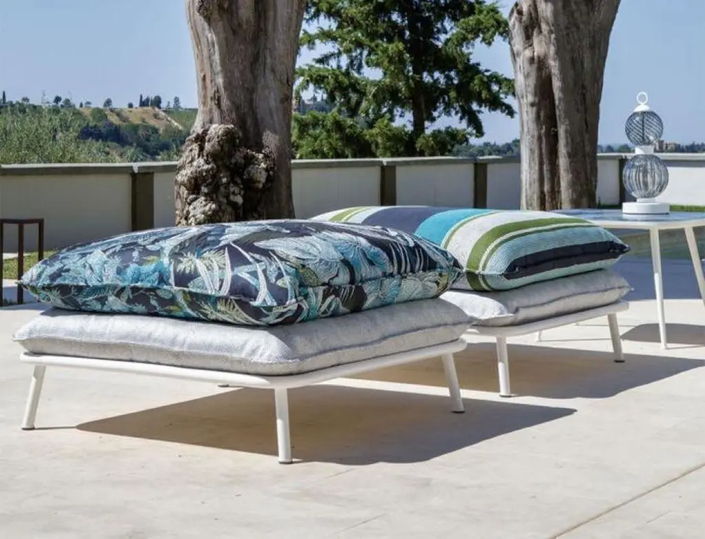 Inspired by one of Sicily's most intriguing islands, the Lipari pouf is the perfect complement for your outdoor spaces. Part of the Lipari series, it is made of matte white aluminium and double cushions in differentiated density polyurethane foam, recyclable polyester fiber, and water-repellent cotton. The cotton upholstery, which is also water-repellent, removable, and washable, has a high resistance to UV rays and saline agents. There is no lack of details, from the branded decorative buckle supported by an outdoor leather belt to the logo visible on the aluminium structure. A cover is available on request to preserve the product during the winter.Outdoor pouf with matt white painted aluminium structure. Padding in different density polyurethane foam and recyclable outdoor polyester fibre and water-repellent cotton. Coating with water-repellent treatment with high resistance to sunlight and saltiness. Totally removable cover. Sunbed includes a decorative buckle in matt white finish with a belt in outdoor leather.
