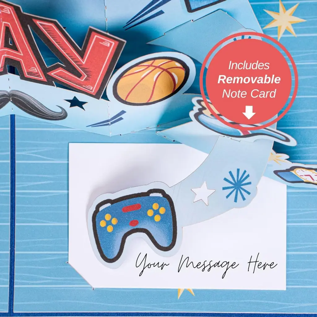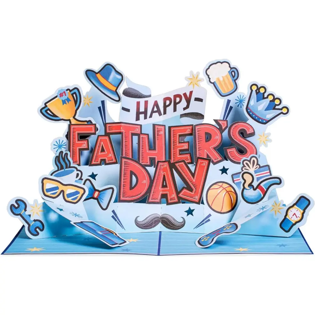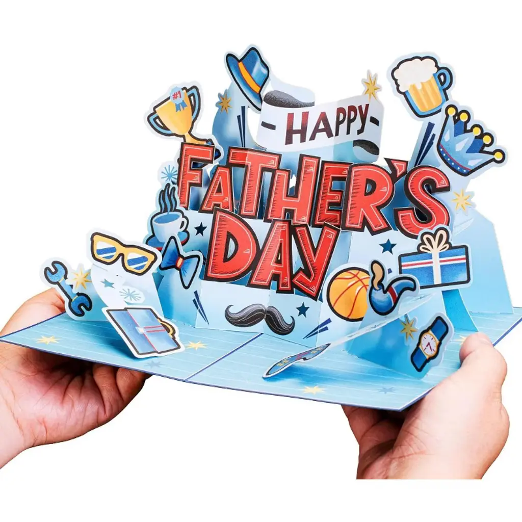 Surprise Him with Style and FunPerfect for Dad, Husband, Son, Grandfather, or anyone special, this Paper Love Father’s Day pop up card features bright red “Happy Fathers Day” lettering paired with playful 3D icons like a mustache, sports gear, and gaming elements. Measuring 5” x 7”, this handcrafted card is intricately laser-cut and assembled by skilled paper artists to create a fun and memorable surprise. It includes a removable note tag so you can add your personal message without disturbing the design. More than just a card, this pop up Father’s Day card is a keepsake full of personality that Dad will treasure long after his special day.