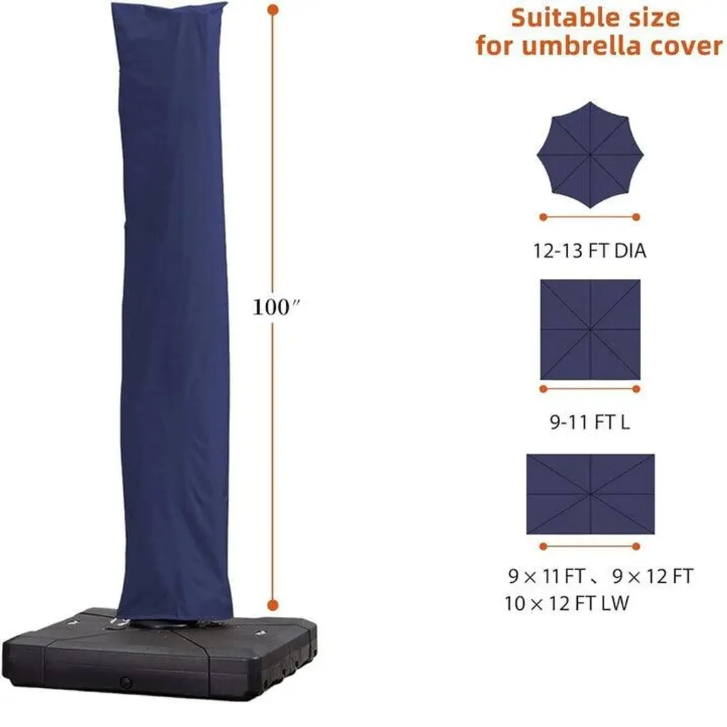 The PURPLELEAF patio umbrella cover fits most of the outdoor patio umbrella perfectly. It is tough enough to protecting your cantilever umbrella, which effectively resistant to rain, wind, hail, snow, dust, fallen leaves, insects and bird droppings. The sturdy zipper, easier to pull up and down, good sealing after closing. Note: Please measure your umbrella dimensions for proper fit. Size may be 1-7mm inaccuracy due to hand measure. S-size for Umbrella:Round : 10 , 11 FTM-size for Umbrella:Round : 12 , 13 FT. Square : 8x8 , 9x9 , 10x10 , 11x11 FTRectangle : 09x11 , 09x12 , 10x12 FTL-size for Umbrella:Square 12FT Rectangle 09x12 , 10x13 FT