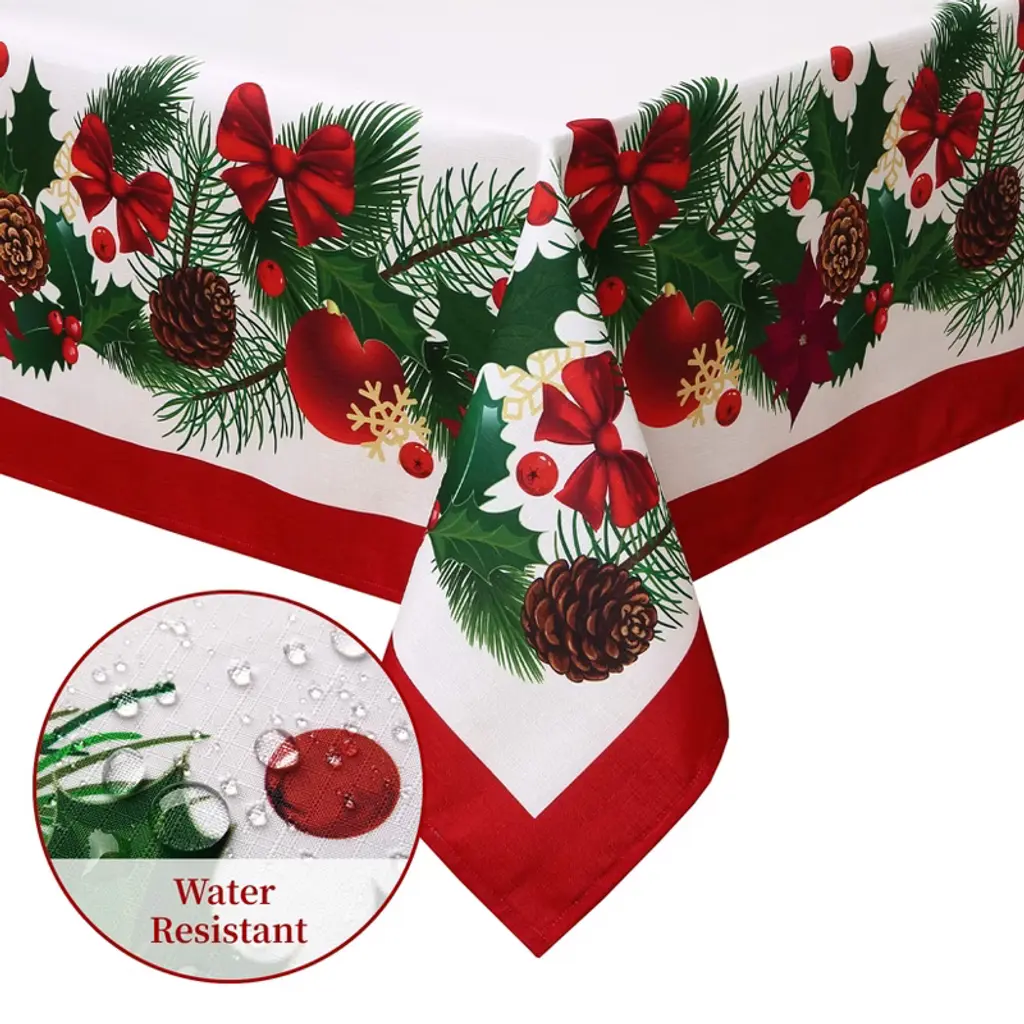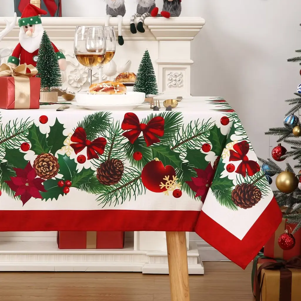 Ready to turn every meal into a festive celebration? Imagine your dining room dressed in a crisp white tablecloth, accented by red bows, pine cones, and lush green branches—setting the scene for joyful gatherings and cozy family dinners. Durable, wrinkle free, and spill proof, this washable table cover keeps your space looking inviting, even during the busiest holiday season. Whether you're hosting a holiday party or enjoying a quiet evening at home, wouldn't you love a tablecloth that blends style, comfort, and convenience while making holiday memories even more special?