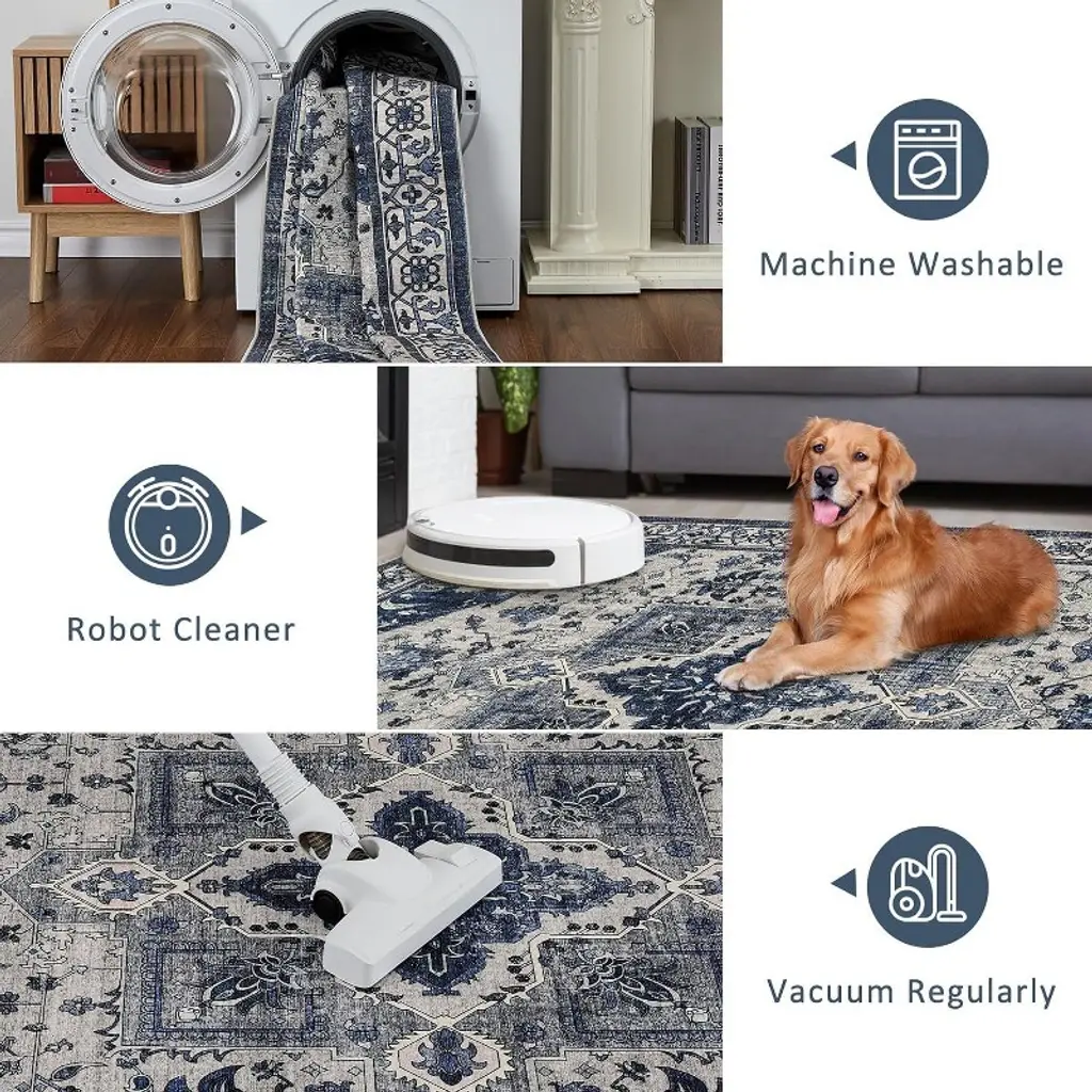 Area Rugs Machine Washable Runner Rugs for Living Room Bedroom Hallway, Non Slip Indoor Soft Accent Distressed Boho Vintage Print Lightweight Thin Low Pile Carpet