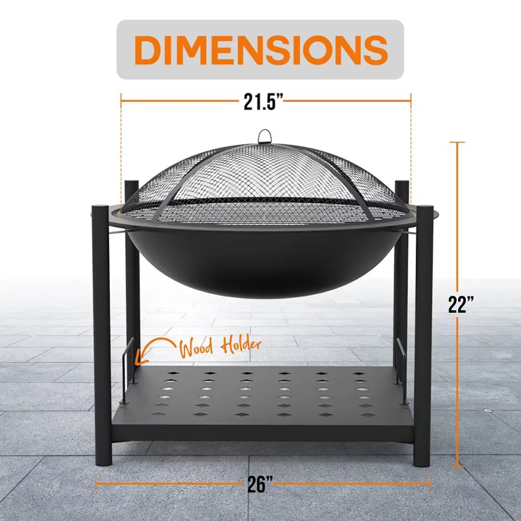Serenelife Portable Outdoor Wood Fire Pit - 2-in-1 Steel Bbq Grill 26" Wood Burning Fire Pit Bowl W/ Mesh Spark Screen, Cover Log Grate Slcarfp54