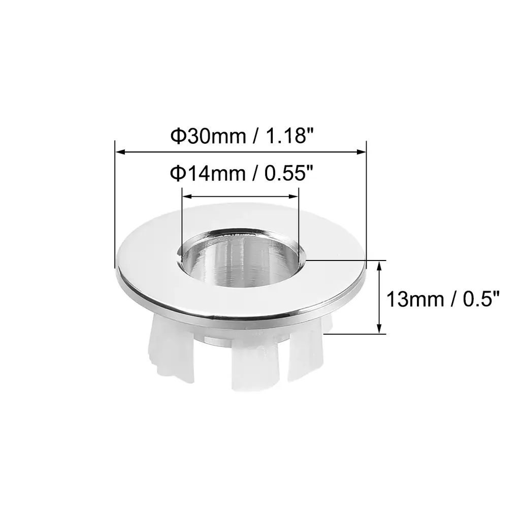 Specification:Fit Aperture: 22mm / 0.87"Outer diameter: 30mm / 1.18"Inner Diameter: 14mm / 0.55"Total Height: 13mm / 0.5"Material: Brass, Plastic; Finish: ElectroplatingPackage Included: 2 x Sink Overflow Covers Description:1. Practical Parts - Useful and practical; drain parts made of brass; plating layer with good adhesion; excellent corrosion.2. No Tools - Simply pushes in and clicks in to place, no tools are required.3. Decorative Look - Decorates the overflow hole but does not block it.4. Ideal Parts - Suitable for all types of ceramic pots on the bathroom sink drain cover.5. Wide Use - Widely used in homes, shopping malls, hotels, factories, including kitchen and bathroom.