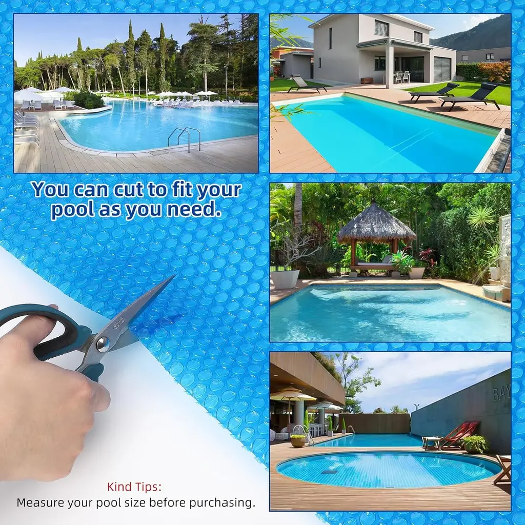 {Extend Swimming Time} The Solar Pool Cover is made of special material. The transparent blue cover absorbs heat through thousands of bubbles during the day and releases heat into the pool, thus allowing for longer swimming time. Let you enjoy a pleasant swimming time! Notice: bubble side is down when use, normal the bubble will be a little deflated before sun exposure due to the principle of thermal expansion and contraction {Reduces Water Evaporation} Placing the cover over the pool when not in use minimizes water loss due to evaporation; helps conserve water and maintain pool levels {Keeping the Water Clean} The Solar Pool Covers are very easy to install. Just place it on the surface of the pool according to the right size of the pool. This will prevent leaves and other debris from falling into the pool and keep it as clean as possible {High Quality Material} Heavy-Duty material with strong welded seams for long lasting use. {Easy to Cut} The solar blanket is suitable for all shapes of pools. If your pool is irregularly shaped, you can cut it according to the size of your pool, as long as you have scissors, you can easily cut the desired size and shape.
