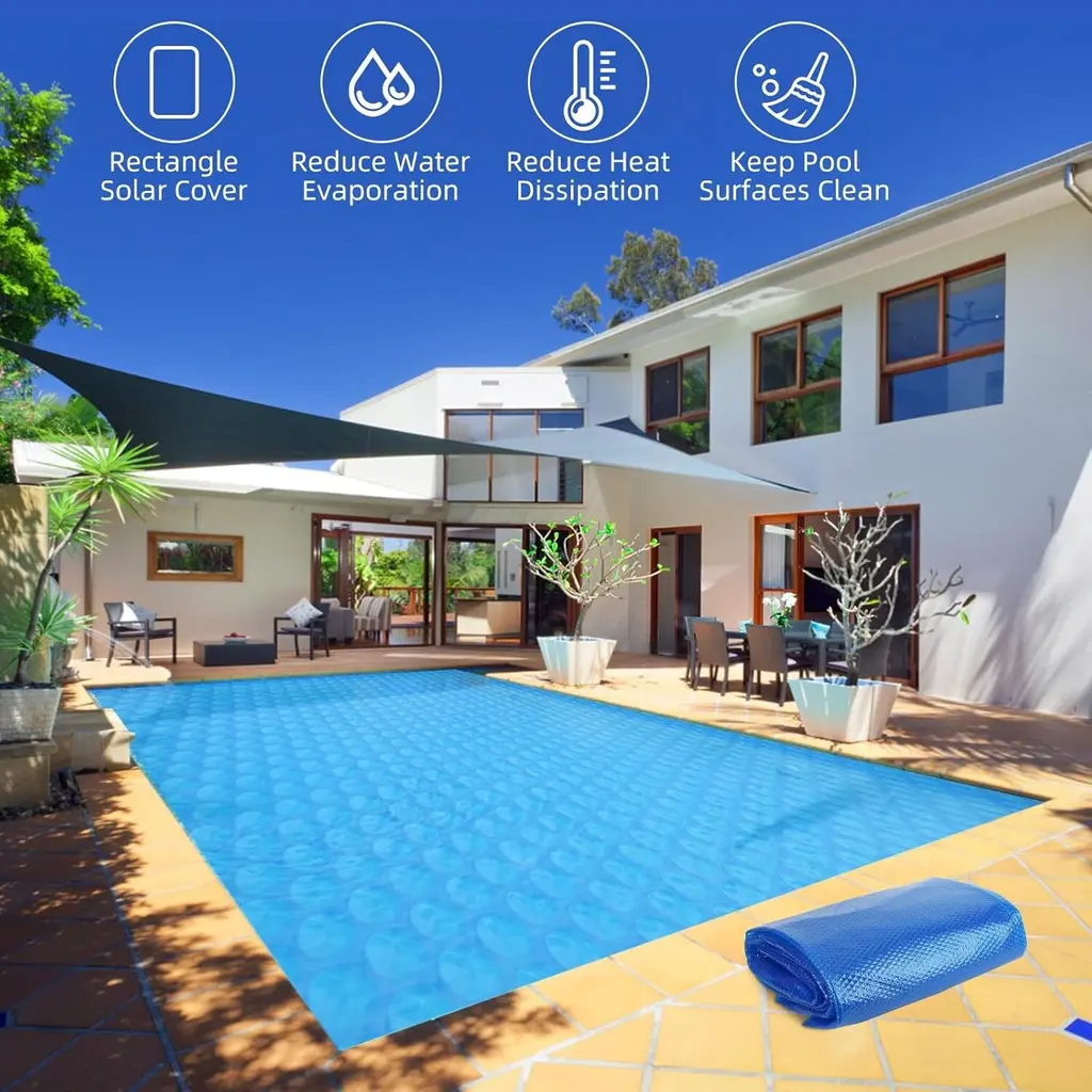 {Extend Swimming Time} The Solar Pool Cover is made of special material. The transparent blue cover absorbs heat through thousands of bubbles during the day and releases heat into the pool, thus allowing for longer swimming time. Let you enjoy a pleasant swimming time! Notice: bubble side is down when use, normal the bubble will be a little deflated before sun exposure due to the principle of thermal expansion and contraction {Reduces Water Evaporation} Placing the cover over the pool when not in use minimizes water loss due to evaporation; helps conserve water and maintain pool levels {Keeping the Water Clean} The Solar Pool Covers are very easy to install. Just place it on the surface of the pool according to the right size of the pool. This will prevent leaves and other debris from falling into the pool and keep it as clean as possible {High Quality Material} Heavy-Duty material with strong welded seams for long lasting use. {Easy to Cut} The solar blanket is suitable for all shapes of pools. If your pool is irregularly shaped, you can cut it according to the size of your pool, as long as you have scissors, you can easily cut the desired size and shape.