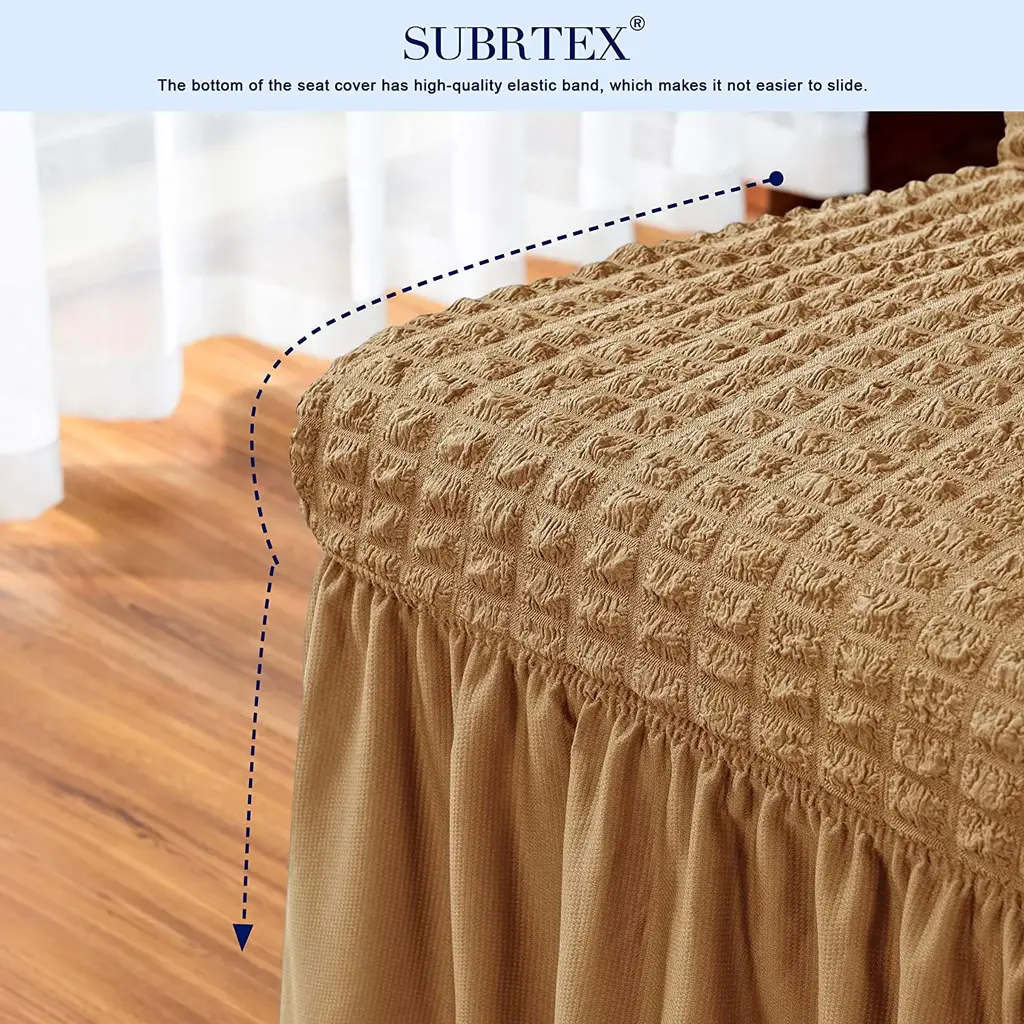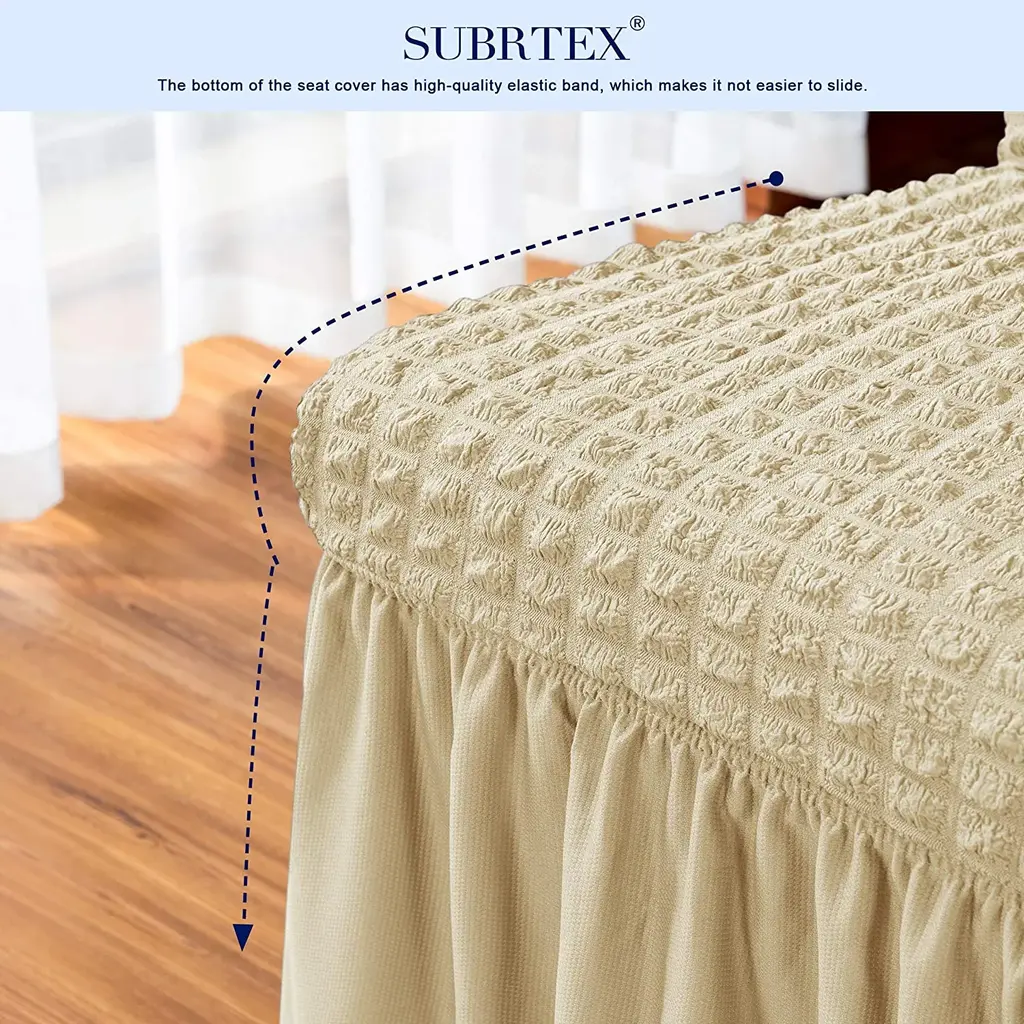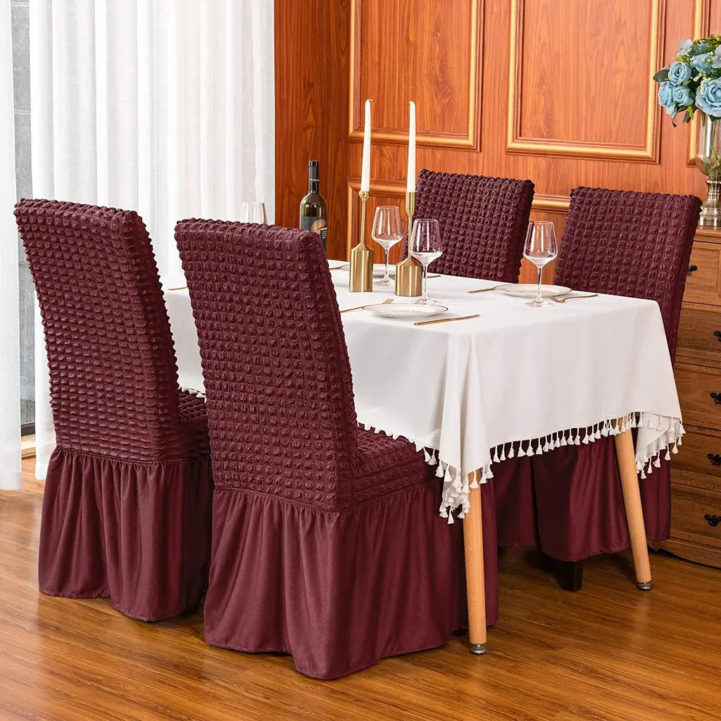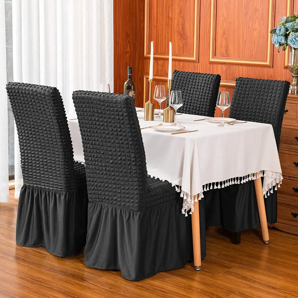 Protect your dining chairs from daily wear and tear while refreshing their appearance with Subrtex Set-of-2 Stretch Dining Chair Cover Ruffle Skirt Slipcovers. Made of soft and stretchable 85% polyester and 15% spandex fabric, these slipcovers are comfortable to the touch and provide a snug fit on most dining chairs. The lotus leaf skirt design adds a touch of elegance to your dining room decor, while the 10 available colors allow you to choose the perfect match for your home kitchen, hotel, or restaurant. Easy to install and care for, these slipcovers are perfect for special events or everyday use.Features:Product Specification: