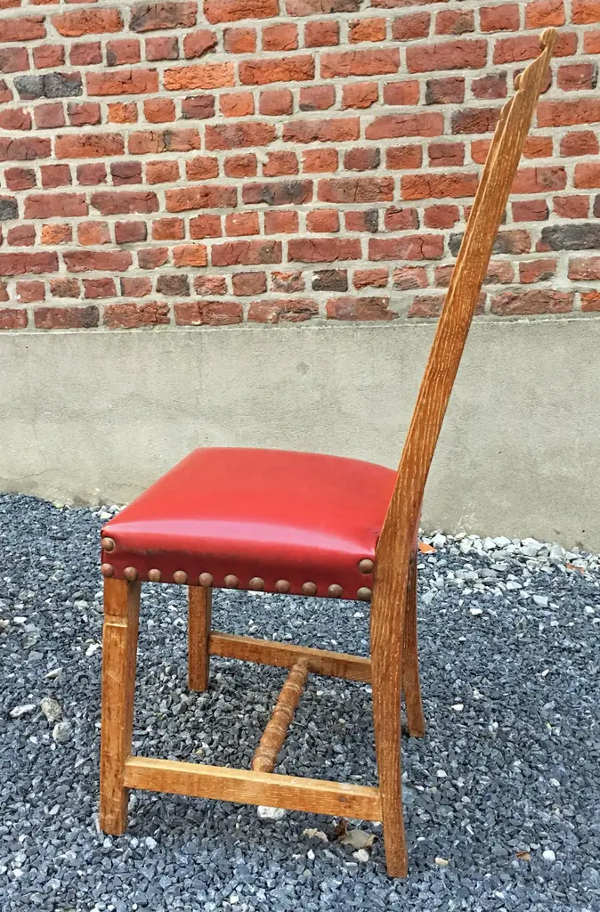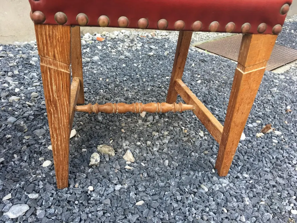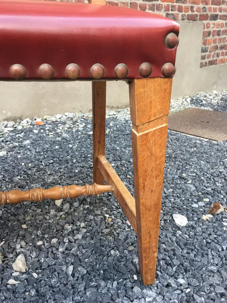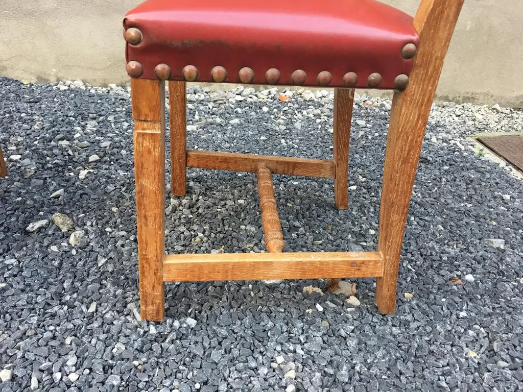 suite of 4 oak chairs, faux leather covering, circa 1950.