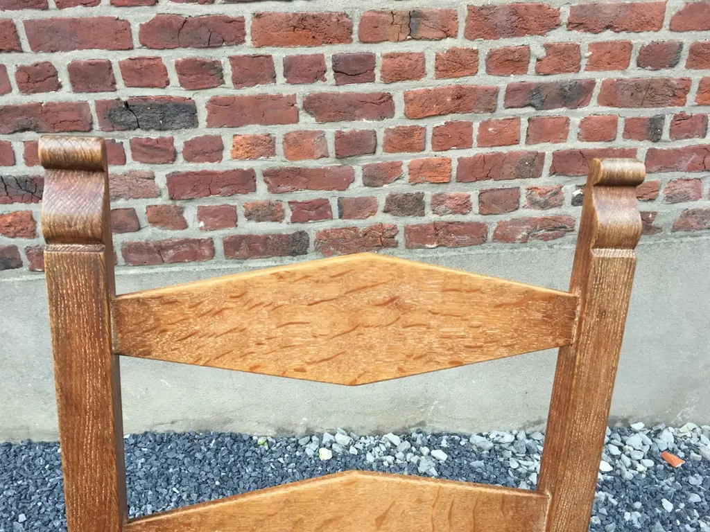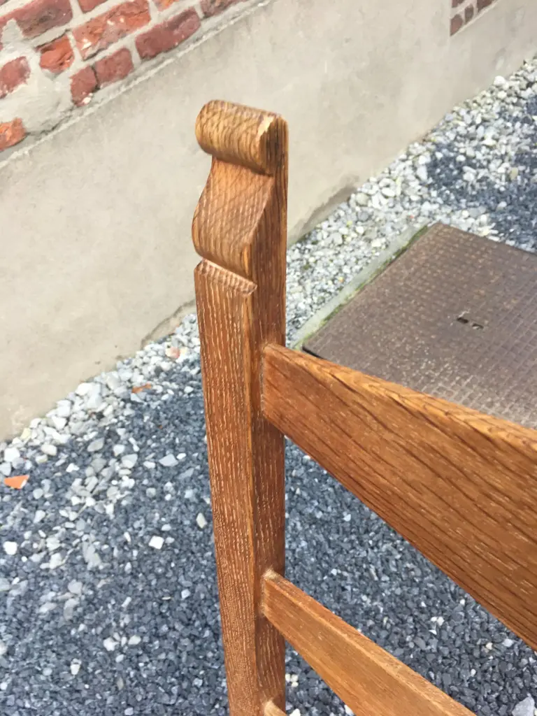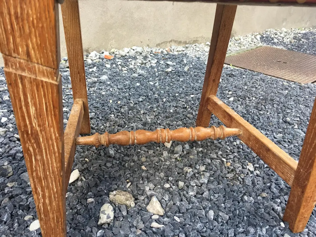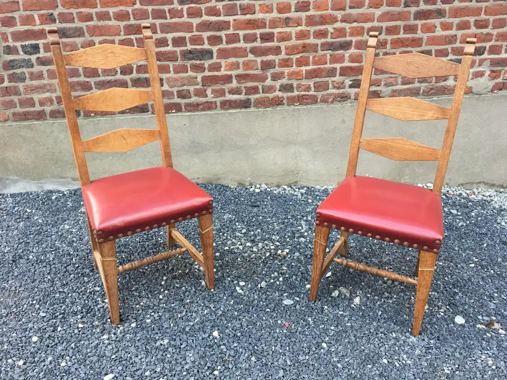 suite of 4 oak chairs, faux leather covering, circa 1950.