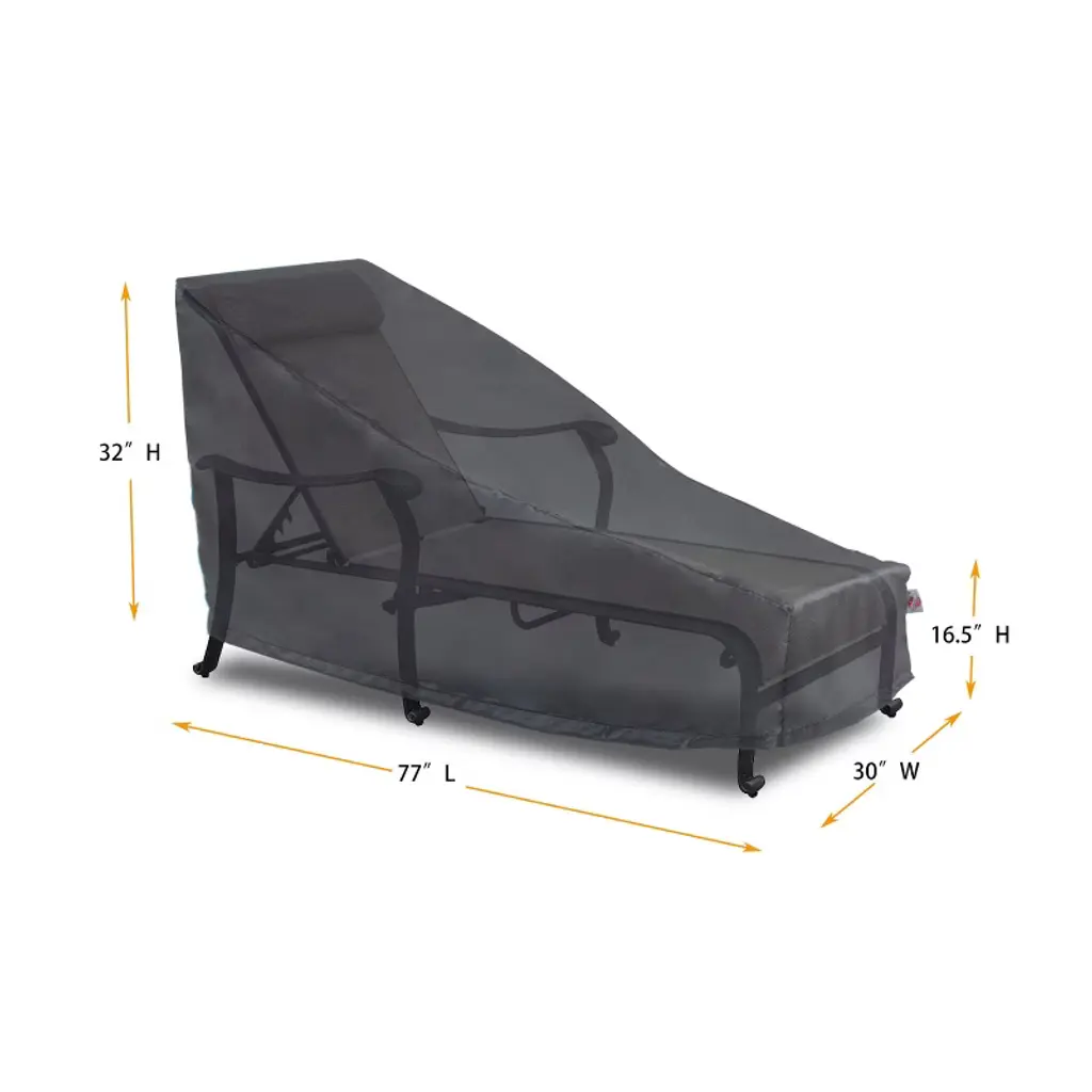 Shield-Gold Chaise Lounge Cover is a 2-layer cover made with 200 denier solution-dyed polyester fabric reinforced with 480D ripstop threads laminated with Thermoplastic Polyurethane (TPU) membrane enabled by our patent-pending lamination technologies. Shield cover offers the best moisture control weather resistant color fastness and temperature tolerance. It will help protect your beloved patio furniture throughout the years. Mold and mildew control: made with NT breathable material to allow moisture to escapte. Temperature tolerance: withstand extreme weather conditions (-35F~275F). No more cracking in the winter. UV Resistant: the outer shell is made of solution-dyed polyester. 1000 UV hours guaranteed. Available size - 77x30, Color: Charcoal Grey.