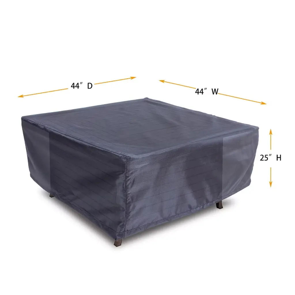 Shield-Gold Fire Table Square Cover is a 2-layer cover made with 200 denier solution-dyed polyester fabric reinforced with 480D ripstop threads laminated with Thermoplastic Polyurethane (TPU) membrane enabled by our patent-pending lamination technologies. Shield cover offers the best moisture control weather resistant color fastness and temperature tolerance. It will help protect your beloved patio furniture throughout the years. : made with NT breathable material to allow moisture to escapte. Temperature tolerance: withstand extreme weather conditions (-35F~275F). No more cracking in the winter. UV Resistant: the outer shell is made of solution-dyed polyester. 1000 UV hours guaranteed. Available size - 44x44, Color: Charcoal Grey.