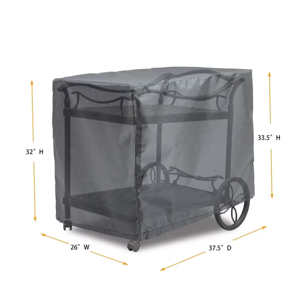 Shield-Gold Tea Cart Cover is a 2-layer cover made with 200 denier solution-dyed polyester fabric reinforced with 480D ripstop threads laminated with Thermoplastic Polyurethane (TPU) membrane enabled by our patent-pending lamination technologies. Shield cover offers the best moisture control weather resistant color fastness and temperature tolerance. It will help protect your beloved patio furniture throughout the years. : made with NT breathable material to allow moisture to escapte. Temperature tolerance: withstand extreme weather conditions (-35F~275F). No more cracking in the winter. UV Resistant: the outer shell is made of solution-dyed polyester. 1000 UV hours guaranteed. Available size - 37.5x26, Color: Charcoal Grey.