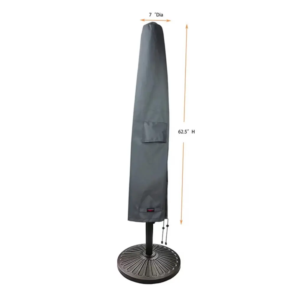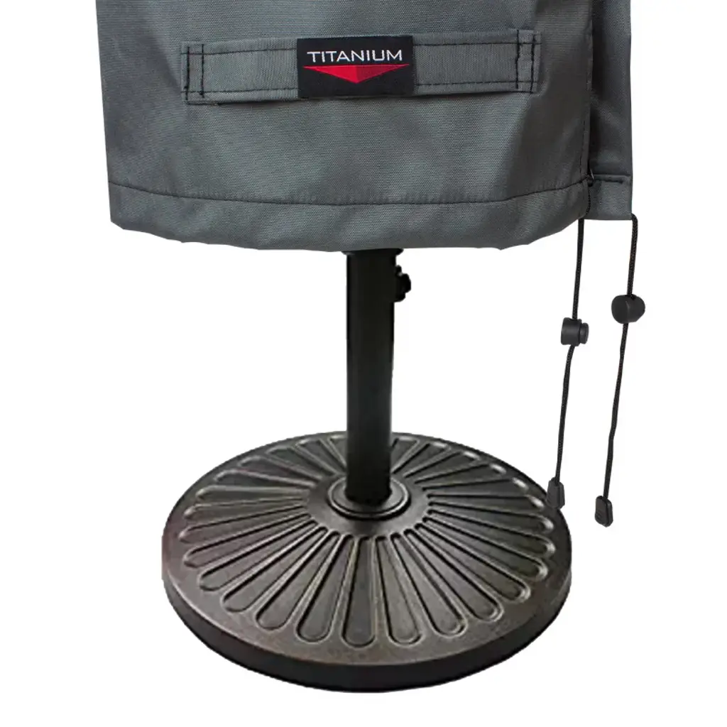 Shield-Titanium Umbrella 9' Cover is a 3-layer cover made with 300D solution-dyed polyester fabric laminated with Thermoplastic Polyurethane (TPU) membrane and velvet knitted liner enabled by our patent-pending lamination technologies. It offers the best moisture control water & weather resistant color fastness and temperature tolerance. It will help protect your beloved patio furniture. Mold and mildew control: Shield 2-way ventilation system; made with breathable material as well as vent windows for enhanced air circulation. Temperature tolerance: withstand extreme weather conditions (-35F ~ 350F). No more cracking in the winter. UV Resistant: 1500 UV hours guaranteed. Available size - 7x62.5 and 7x72, Color: Dark Grey.
